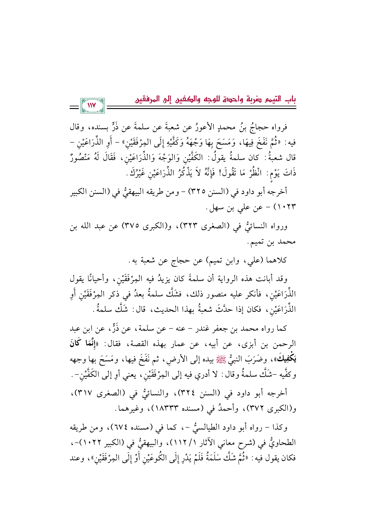 وقد أبانت هذه الرواية أن سلمةَ كان يزيدُ فيه المِرْفَقَيْنِ، وأحيانًا يقول الذِّرَاعَيْنِ، فأنكر عليه منصور ذلك، فشَكَّ سلمةُ بعدُ في ذكر المِرْفَقَيْنِ أَوِ الذِّرَاعَيْنِ، فكان إذا حدَّثَ شعبةُ بهذا الحديث، قال: شَكَّ سلمةُ.