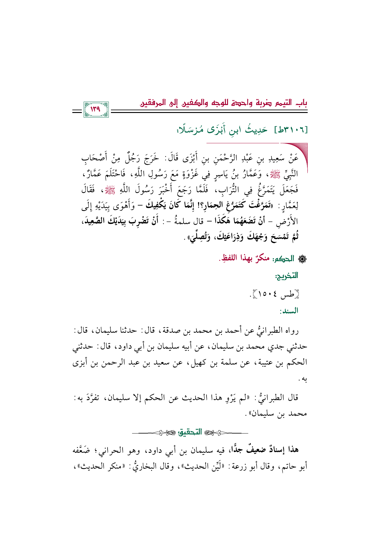 رواه الطبرانيُّ عن أحمد بن محمد بن صدقة، قال: حدثنا سليمان، قال: حدثني جدي محمد بن سليمان، عن أبيه سليمان بن أبي داود، قال: حدثني الحكم بن عتيبة، عن سلمة بن كهيل، عن سعيد بن عبد الرحمن بن أبزى به.