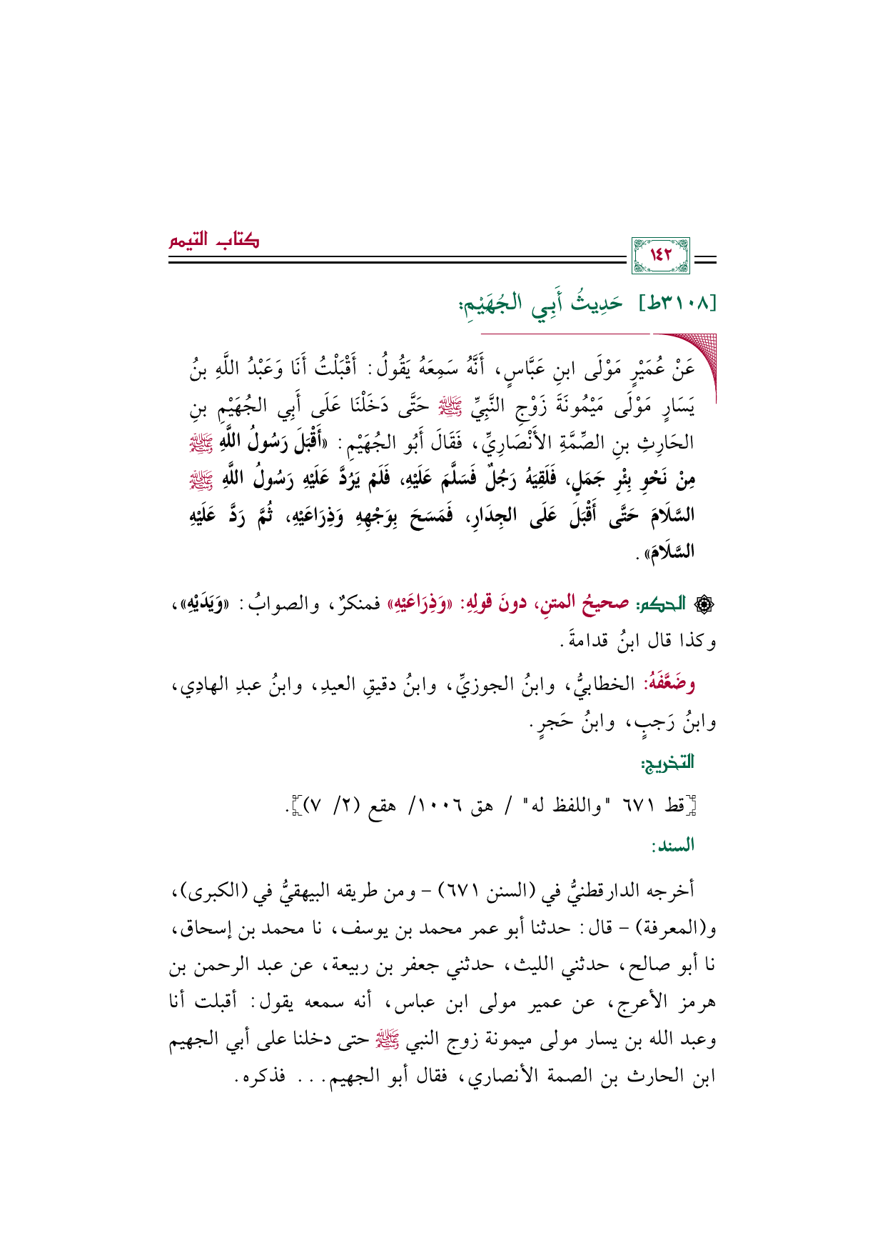 أخرجه الدارقطنيُّ في (السنن ٦٧١) -ومن طريقه البيهقيُّ في (الكبرى)، و (المعرفة) - قال: حدثنا أبو عمر محمد بن يوسف، نا محمد بن إسحاق، نا أبو صالح، حدثني الليث، حدثني جعفر بن ربيعة، عن عبد الرحمن بن هرمز الأعرج، عن عمير مولى ابن عباس، أنه سمعه يقول: أقبلت أنا وعبد الله بن يسار مولى ميمونة زوج النبي صلى الله عليه وسلم حتى دخلنا على أبي الجهيم بن الحارث بن الصمة الأنصاري، فقال أبو الجهيم ... فذكره.