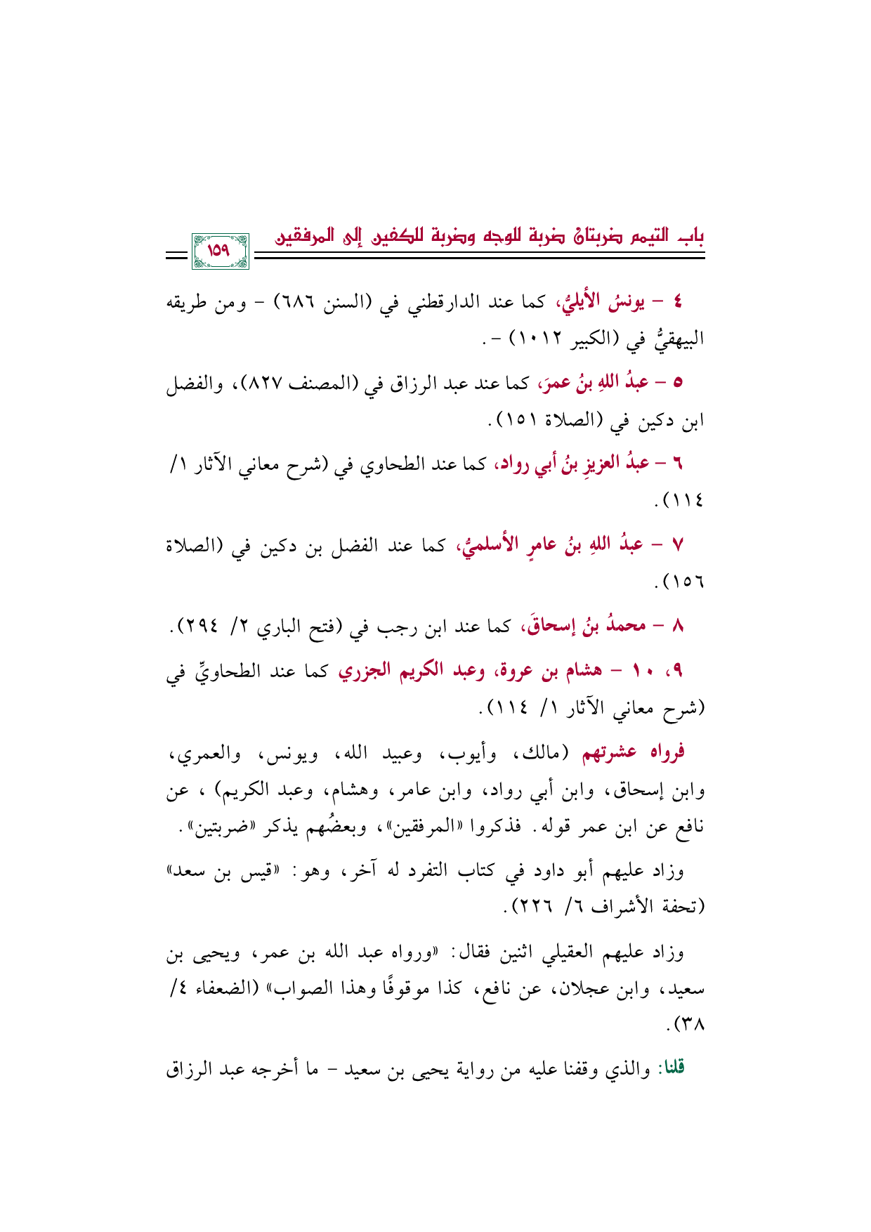 فرواه عشرتهم (مالك، وأيوب، وعبيد الله، ويونس، والعمري، وابن إسحاق، وابن أبي رواد، وابن عامر، وهشام، وعبد الكريم)، عن نافع عن ابن عمر قوله. فذكروا "المرفقين"، وبعضُهم يذكر "ضربتين".
