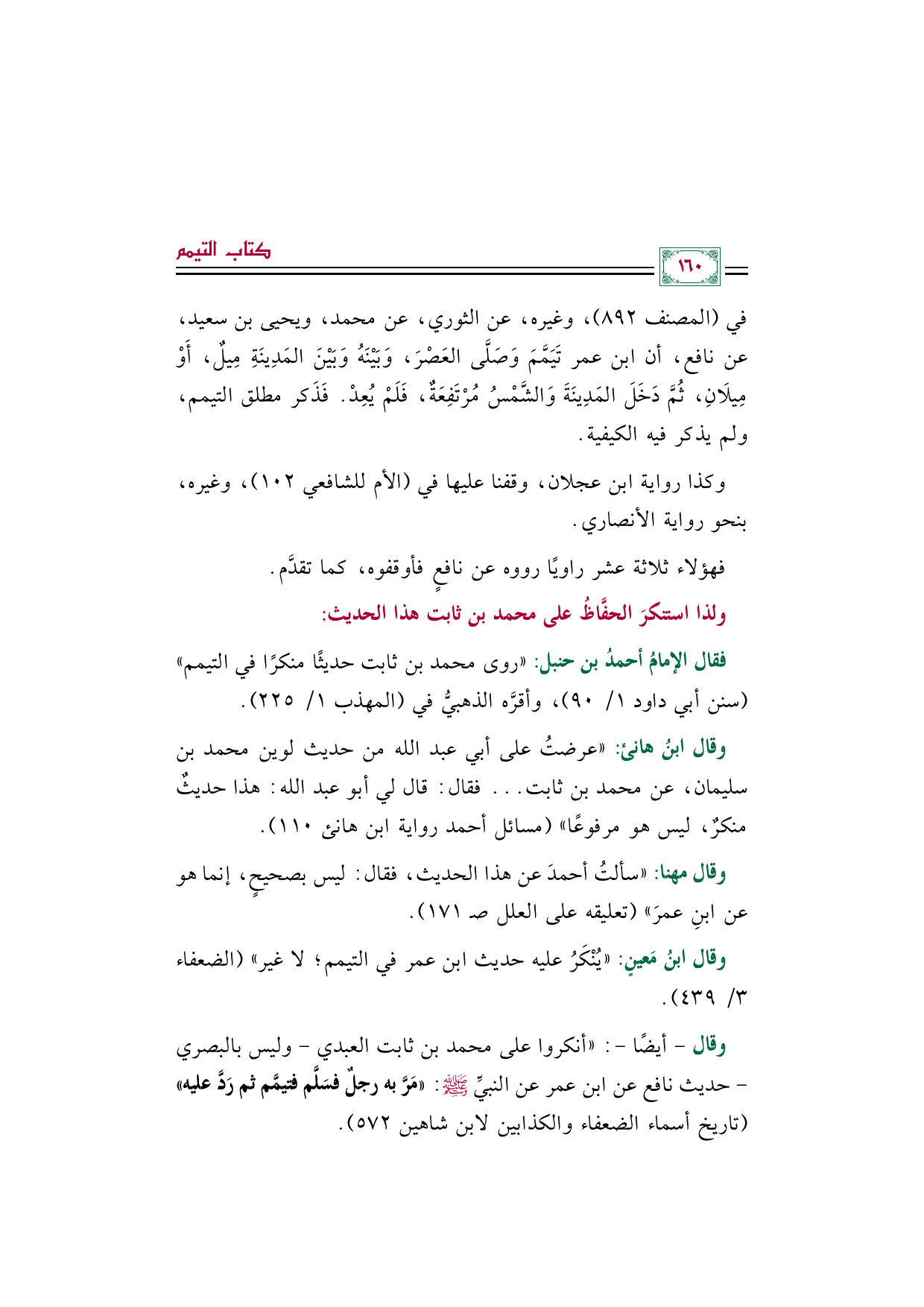 فقال الإمامُ أحمدُ بن حنبل: "روى محمد بن ثابت حديثًا منكرًا في التيمم" (سنن أبي داود ١/ ٩٠)، وأقرَّه الذهبيُّ في (المهذب ١/ ٢٢٥).