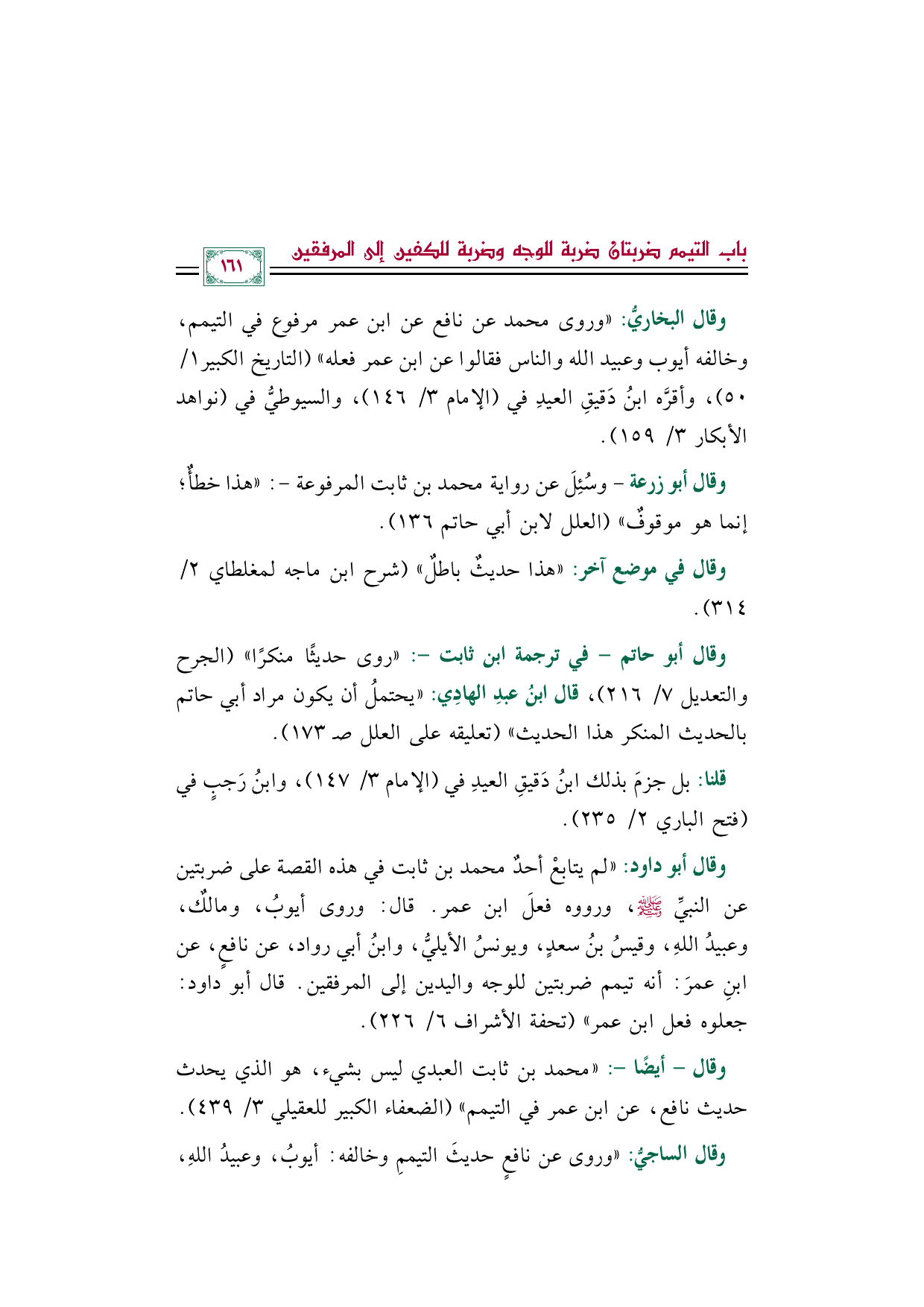 وقال البخاريُّ: "وروى محمد عن نافع عن ابن عمر مرفوع في التيمم، وخالفه أيوب وعبيد الله والناس فقالوا عن ابن عمر فعله" (التاريخ الكبير ١/ ٥٠)، وأقرَّه ابنُ دَقيقِ العيدِ في (الإمام ٣/ ١٤٦)، والسيوطيُّ في (نواهد الأبكار ٣/ ١٥٩).