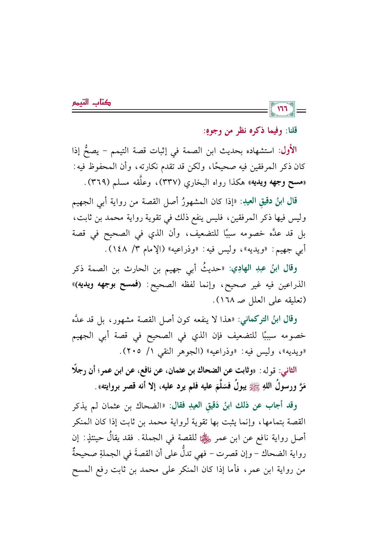 وقال ابنُ عبدِ الهادِي: "حديثُ أبي جهيم بن الحارث بن الصمة ذكر الذراعين فيه غير صحيح، وإنما لفظه الصحيح: (فمسح بوجهه ويديه) " (تعليقه على العلل صـ ١٦٨).