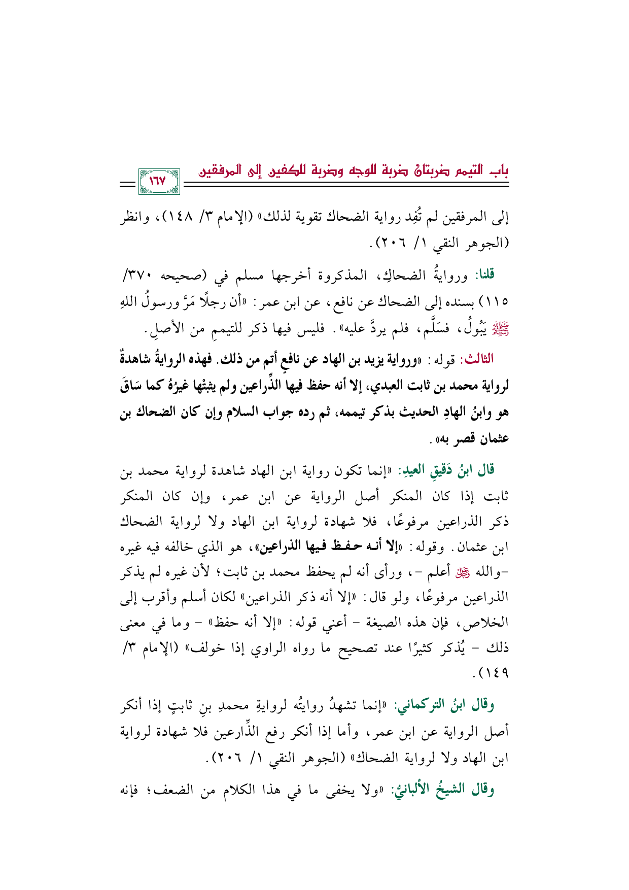 الثالث: قوله: "ورواية يزيد بن الهاد عن نافعٍ أتم من ذلك. فهذه الروايةُ شاهدةٌ لرواية محمد بن ثابت العبدي، إلا أنه حفظ فيها الذِّراعين ولم يثبتْها غيرُهُ كما سَاقَ هو وابنُ الهادِ الحديث بذكر تيممه، ثم رده جواب السلام وإن كان الضحاك بن عثمان قصر به".
