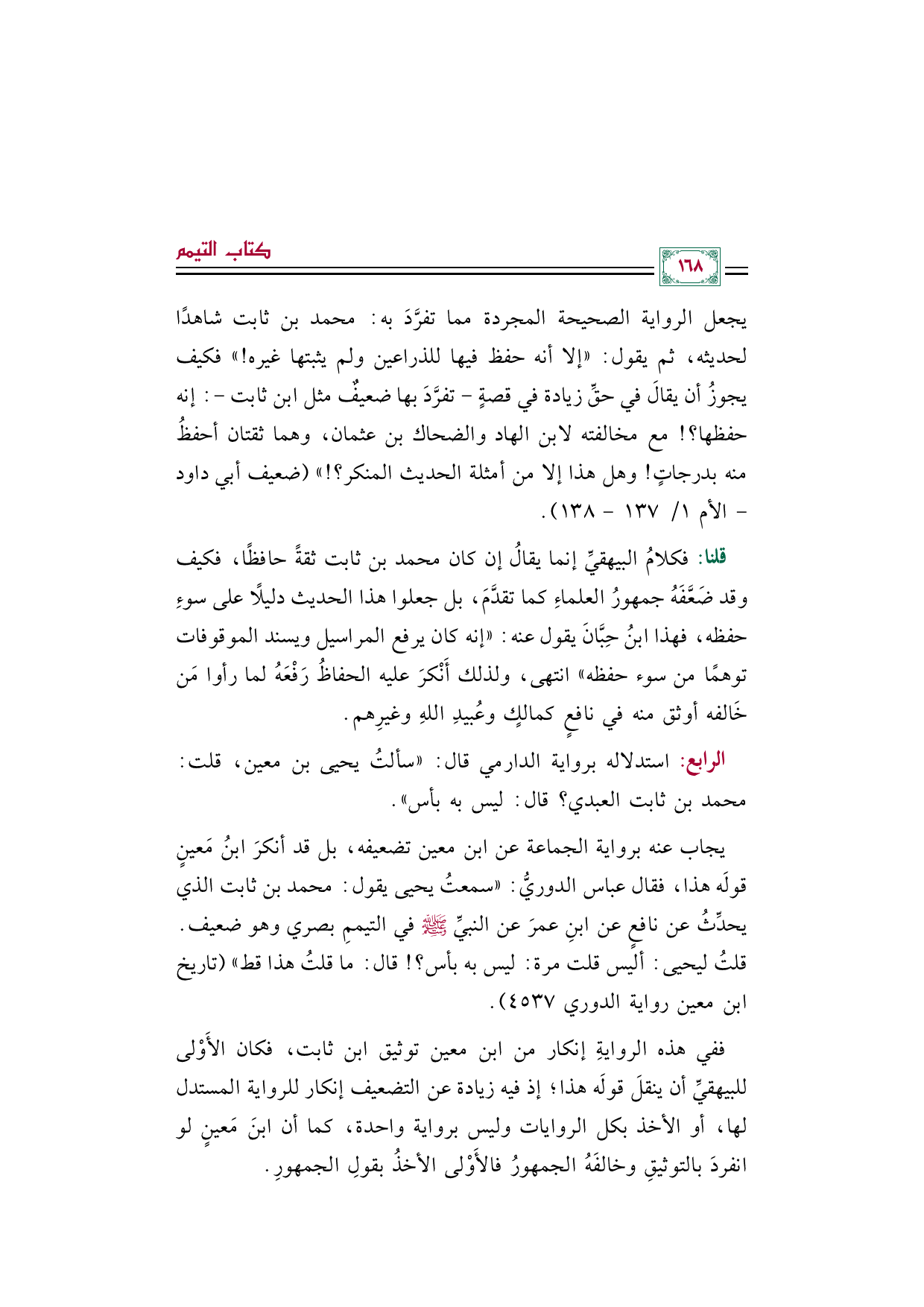 ففي هذه الروايةِ إنكار من ابن معين توثيق ابن ثابت، فكان الأَوْلى للبيهقيِّ أن ينقلَ قولَه هذا؛ إذ فيه زيادة عن التضعيف إنكار للرواية المستدل لها، أو الأخذ بكل الروايات وليس برواية واحدة، كما أن ابنَ مَعينٍ لو انفردَ بالتوثيقِ وخالفَهُ الجمهورُ فالأَوْلى الأخذُ بقولِ الجمهورِ.