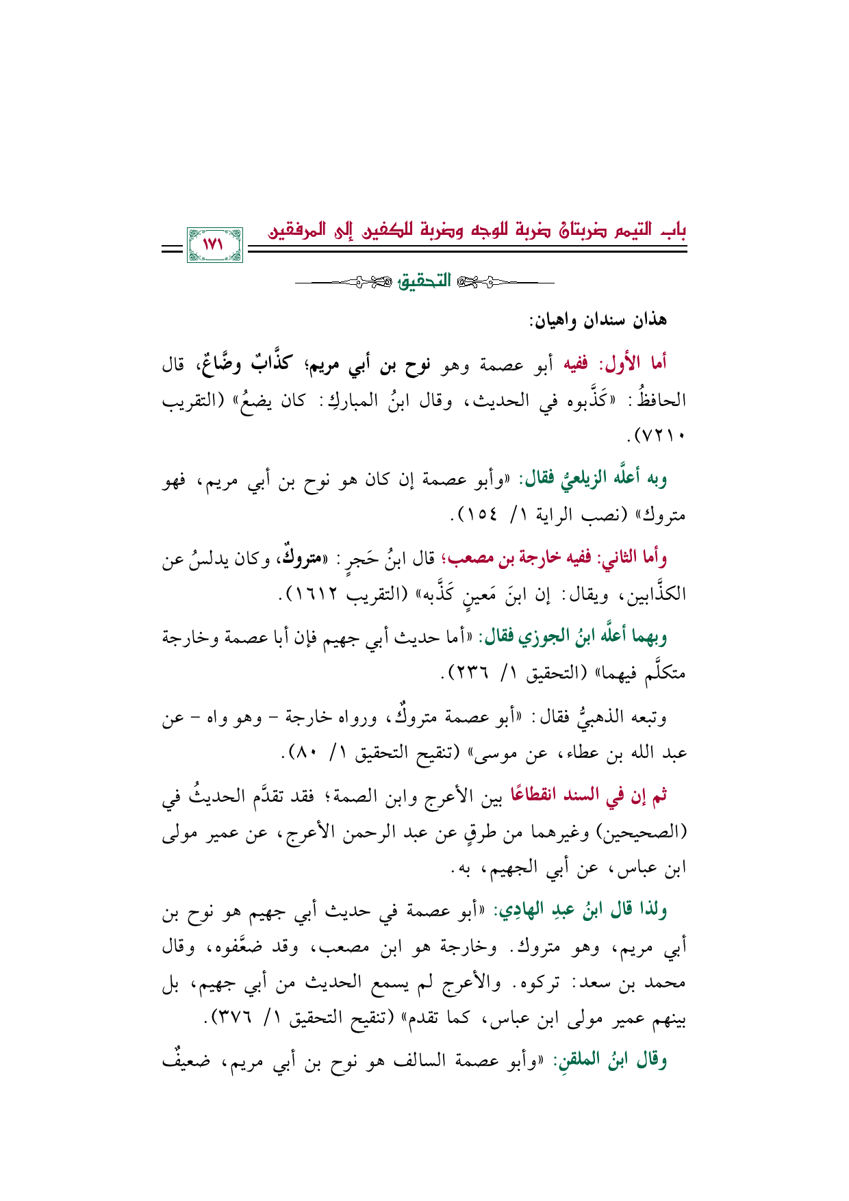 ولذا قال ابنُ عبدِ الهادِي: "أبو عصمة في حديث أبي جهيم هو نوح بن أبي مريم، وهو متروك. وخارجة هو ابن مصعب، وقد ضعَّفوه، وقال محمد بن سعد: تركوه. والأعرج لم يسمع الحديث من أبي جهيم، بل بينهم عمير مولى ابن عباس، كما تقدم" (تنقيح التحقيق ١/ ٣٧٦).