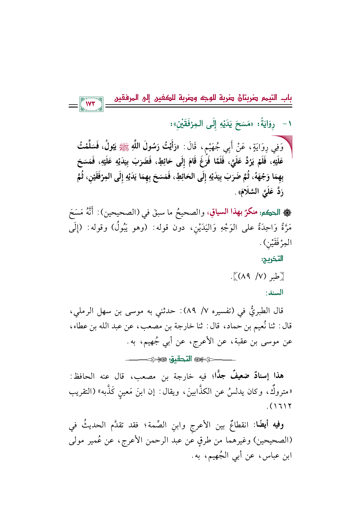 قال الطبريُّ في (تفسيره ٧/ ٨٩): حدثني به موسى بن سهل الرملي، قال: ثنا نُعيم بن حماد، قال: ثنا خارجة بن مصعب، عن عبد الله بن عطاء، عن موسى بن عقبة، عن الأعرج، عن أبي جُهيم، به.