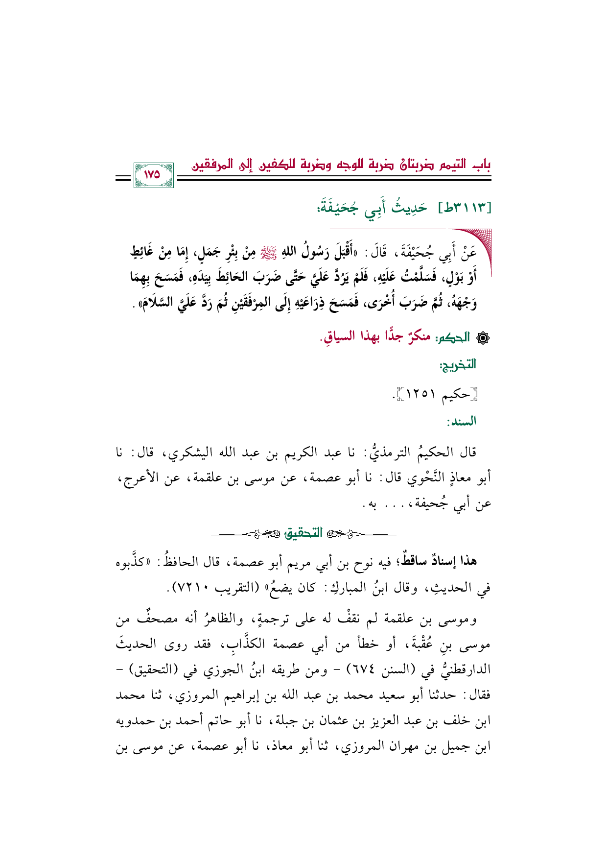 قال الحكيمُ الترمذيُّ: نا عبد الكريم بن عبد الله اليشكري، قال: نا أبو معاذٍ النَّحْوي قال: نا أبو عصمة، عن موسى بن علقمة، عن الأعرج، عن أبي جُحيفة، ... به.