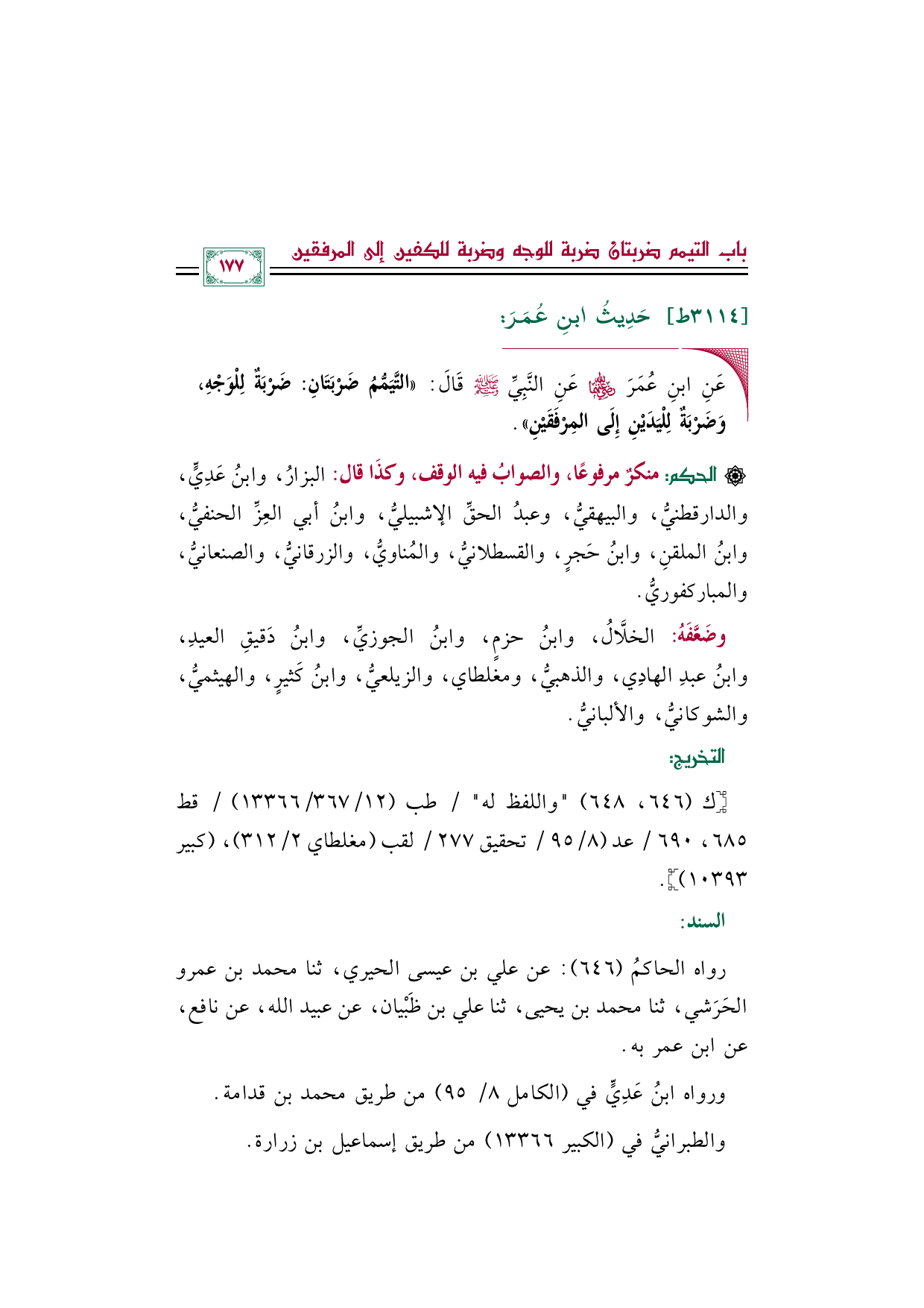 ◼ عَنِ ابنِ عُمَرَ رضي الله عنهما عَنِ النَّبِيِّ صلى الله عليه وسلم قَالَ: ((التَّيَمُّمُ ضَرْبَتَانِ: ضَرْبَةٌ لِلْوَجْهِ، وَضَرْبَةٌ لِلْيَدَيْنِ إِلَى المِرْفَقَيْنِ)).