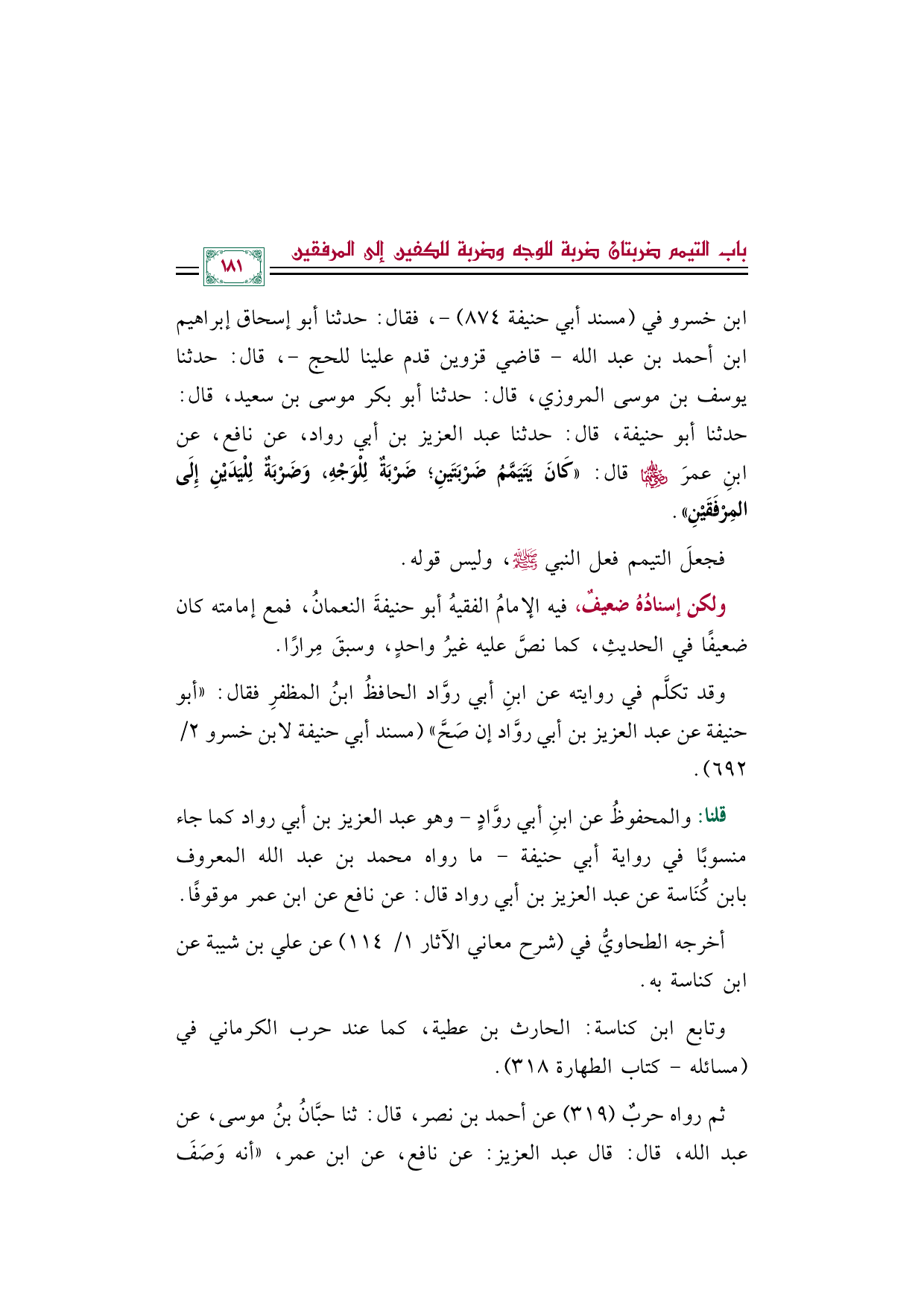 ابن خسرو في (مسند أبي حنيفة ٨٧٤) -، فقال: حدثنا أبو إسحاق إبراهيم بن أحمد بن عبد الله -قاضي قزوين قدم علينا للحج-، قال: حدثنا يوسف بن موسى المروزي، قال: حدثنا أبو بكر موسى بن سعيد، قال: حدثنا أبو حنيفة، قال: حدثنا عبد العزيز بن أبي رواد، عن نافع، عن ابنِ عمرَ رضي الله عنهما قال: ((كَانَ يَتَيَمَّمُ ضَرْبَتَينِ؛ ضَرْبَةٌ لِلْوَجْهِ، وَضَرْبَةٌ لِلْيَدَيْنِ إِلَى المِرْفَقَيْنِ)).