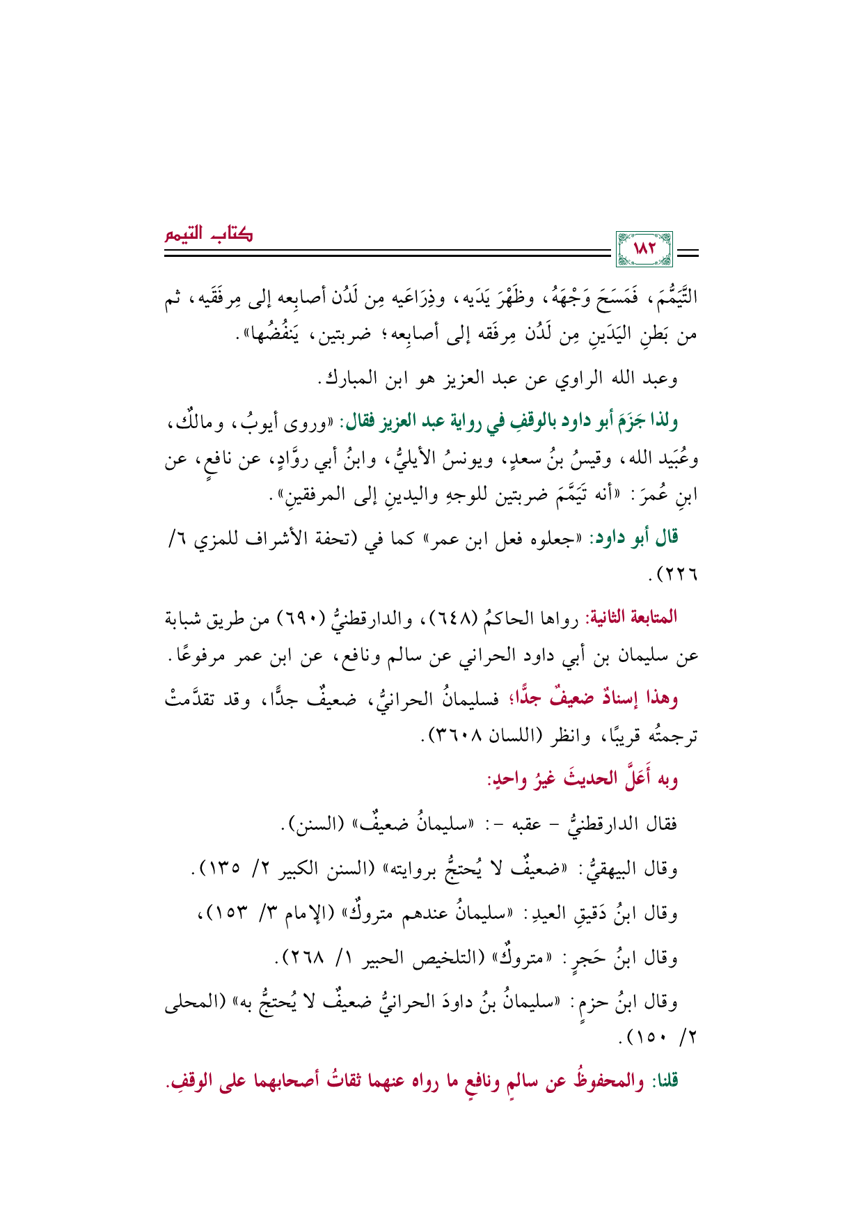ولذا جَزَمَ أبو داود بالوقفِ في رواية عبد العزيز فقال: "وروى أيوبُ، ومالكٌ، وعُبَيد الله، وقيسُ بنُ سعدٍ، ويونسُ الأيليُّ، وابنُ أبي روَّادٍ، عن نافعٍ، عن ابنِ عُمرَ: ((أنه تَيَمَّمَ ضربتين للوجهِ واليدينِ إلى المرفقينِ)).
