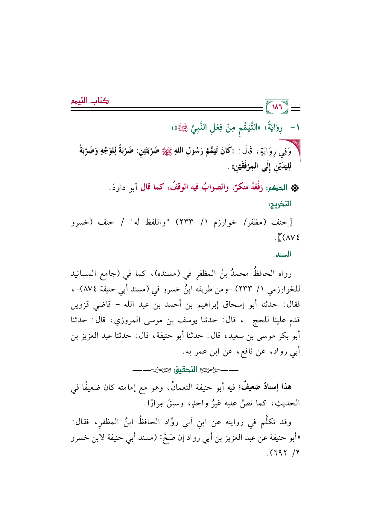 هذا إسنادٌ ضعيفٌ؛ فيه أبو حنيفة النعمانُ، وهو مع إمامته كان ضعيفًا في الحديثِ، كما نصَّ عليه غيرُ واحدٍ، وسبقَ مِرارًا.