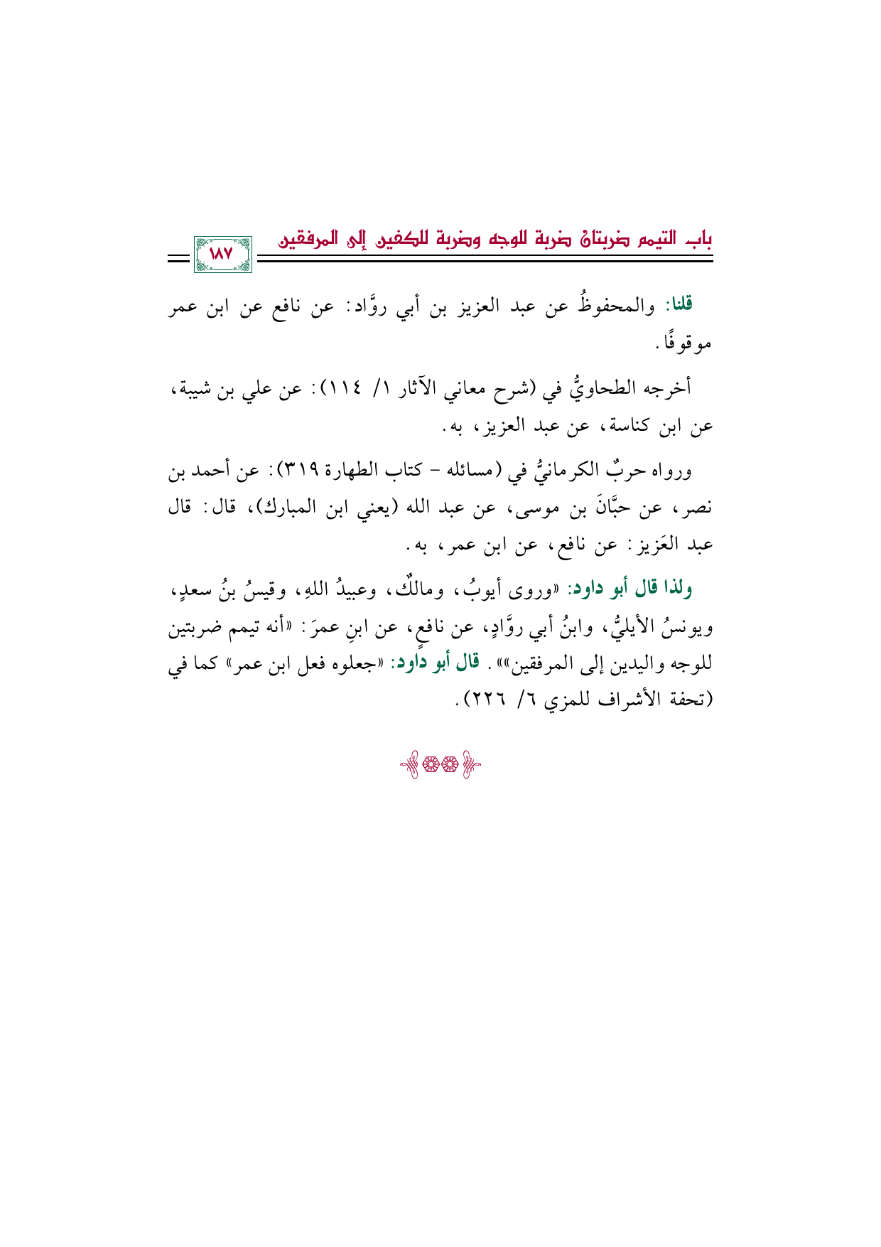 ولذا قال أبو داود: "وروى أيوبُ، ومالكٌ، وعبيدُ اللهِ، وقيسُ بنُ سعدٍ، ويونسُ الأيليُّ، وابنُ أبي روَّادٍ، عن نافعٍ، عن ابنِ عمرَ: ((أنه تيمم ضربتين للوجه واليدين إلى المرفقين)) ". قال أبو داود: "جعلوه فعل ابن عمر" كما في (تحفة الأشراف للمزي ٦/ ٢٢٦).
