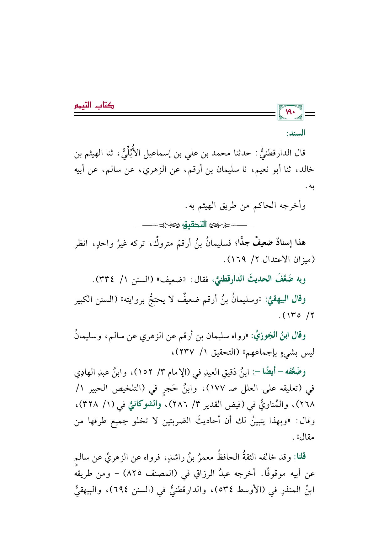 وضَعَّفه -أيضًا-: ابنُ دَقيقِ العيدِ في (الإمام ٣/ ١٥٢)، وابنُ عبدِ الهادِي في (تعليقه على العلل صـ ١٧٧)، وابنُ حَجرٍ في (التلخيص الحبير ١/ ٢٦٨)، والمُناويُّ في (فيض القدير ٣/ ٢٨٦)، والشوكانيُّ في (١/ ٣٢٨)، وقال: "وبهذا يتبينُ لك أن أحاديثَ الضربتين لا تخلو جميع طرقها من مقال".