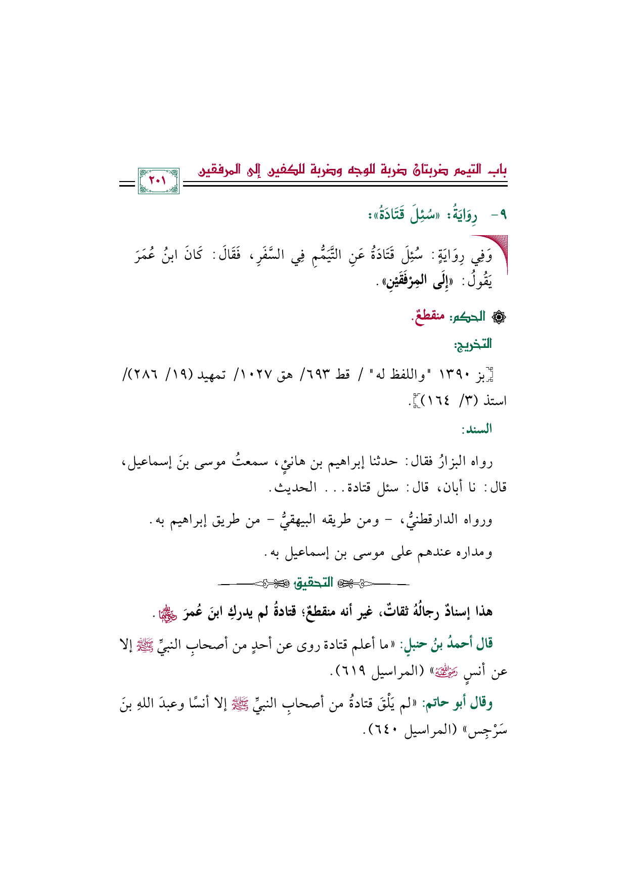 رواه البزارُ فقال: حدثنا إبراهيم بن هانئٍ، سمعتُ موسى بنَ إسماعيل، قال: نا أبان، قال: سئل قتادة ... الحديث.