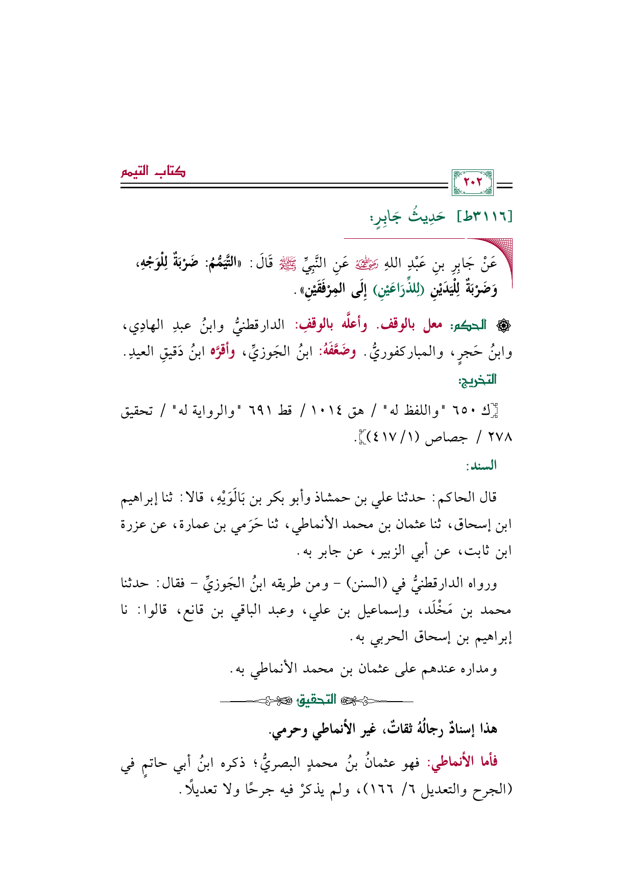 ◼ عَنْ جَابِرِ بنِ عَبْدِ اللهِ رضي الله عنه عَنِ النَّبِيِّ صلى الله عليه وسلم قَالَ: ((التَّيَمُّمُ: ضَرْبَةٌ لِلْوَجْهِ، وَضَرْبَةٌ لِلْيَدَيْنِ (لِلذِّرَاعَيْنِ) إِلَى المِرْفَقَيْنِ)).