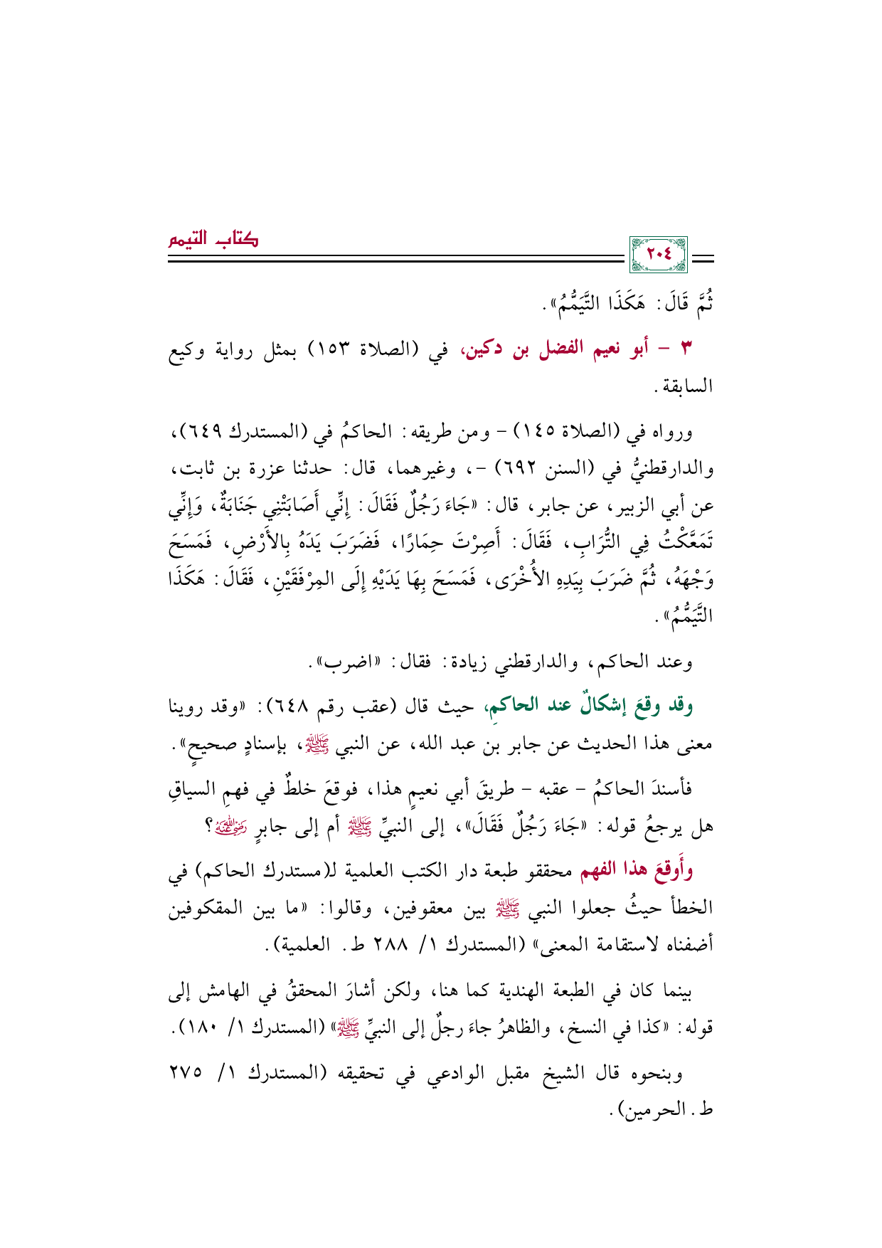 ورواه في (الصلاة ١٤٥) -ومن طريقه: الحاكمُ في (المستدرك ٦٤٩)، والدارقطنيُّ في (السنن ٦٩٢) -، وغيرهما، قال: حدثنا عزرة بن ثابت، عن أبي الزبير، عن جابر، قال: ((جَاءَ رَجُلٌ فَقَالَ: إِنِّي أَصَابَتْنِي جَنَابَةٌ، وَإِنِّي تَمَعَّكْتُ فِي التُّرَابِ، فَقَالَ: أَصِرْتَ حِمَارًا، فَضَرَبَ يَدَهُ بِالأَرْضِ، فَمَسَحَ وَجْهَهُ، ثُمَّ ضَرَبَ بِيَدِهِ الأُخْرَى، فَمَسَحَ بِهَا يَدَيْهِ إِلَى المِرْفَقَيْنِ، فَقَالَ: هَكَذَا التَّيَمُّمُ)).