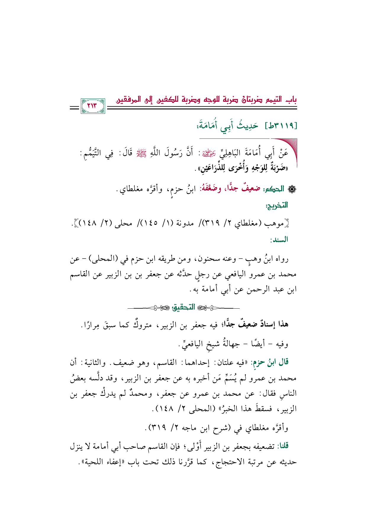 قلنا: تضعيفه بجعفر بن الزبير أَوْلى؛ فإن القاسم صاحب أبي أمامة لا ينزل حديثه عن مرتبة الاحتجاج، كما قرَّرنا ذلك تحت باب "إعفاء اللحية".