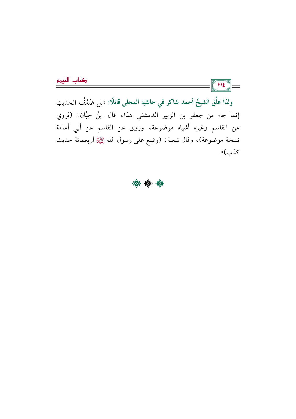 ولذا علَّق الشيخُ أحمد شاكر في حاشية المحلى قائلًا: "بل ضَعْفُ الحديثِ إنما جاء من جعفر بن الزبير الدمشقي هذا، قال ابنُ حِبَّانَ: (يَروي عن القاسم وغيره أشياء موضوعة، وروى عن القاسم عن أبي أمامة نسخة موضوعة)، وقال شعبة: (وضع على رسول الله صلى الله عليه وسلم أربعمائة حديث كذب) ".