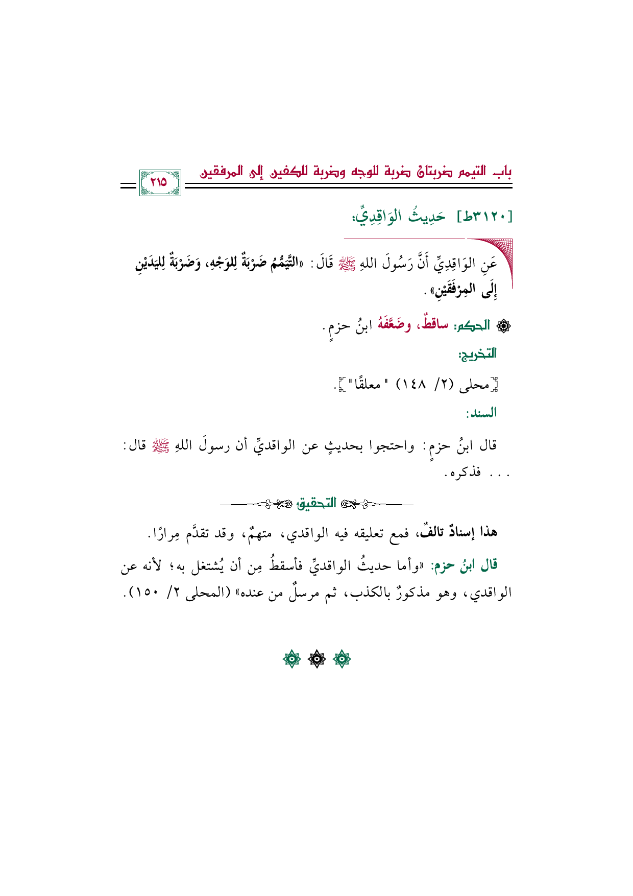 ◼ عَنِ الوَاقِدِيِّ أَنَّ رَسُولَ اللهِ صلى الله عليه وسلم قَالَ: ((التَّيَمُّمُ ضَرْبَةٌ لِلوَجْهِ، وَضَرْبَةٌ لِليَدَيْنِ إِلَى المِرْفَقَيْنِ)).