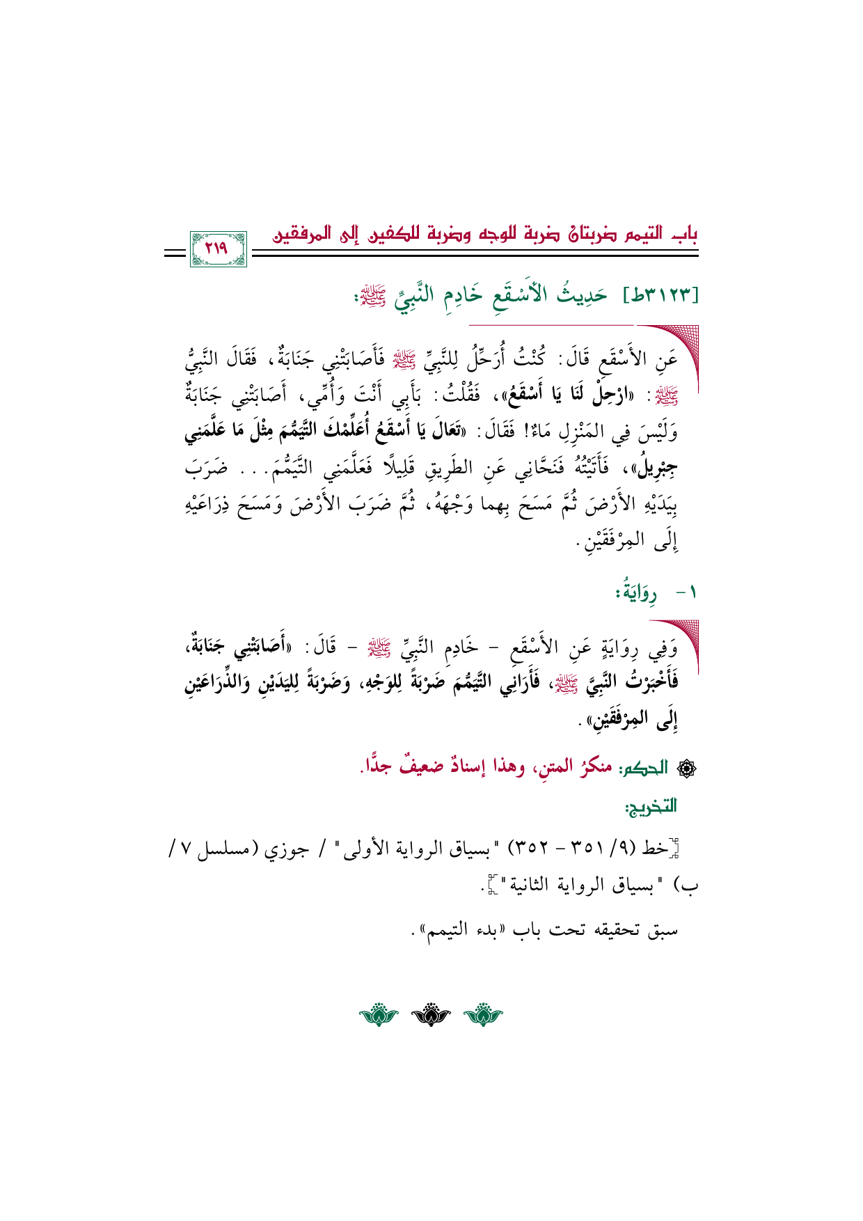 ◼ عَنِ الأَسْقَعِ قَالَ: كُنْتُ أُرَحِّلُ لِلنَّبِيِّ صلى الله عليه وسلم فَأَصَابَتْنِي جَنَابَةٌ، فَقَالَ النَّبِيُّ صلى الله عليه وسلم: ((ارْحِلْ لَنَا يَا أَسْقَعُ))، فَقُلْتُ: بَأَبِي أَنْتَ وَأُمِّي، أَصَابَتْنِي جَنَابَةٌ وَلَيْسَ فِي المَنْزِلِ مَاءٌ! فَقَالَ: ((تَعَالَ يَا أَسْقَعُ أُعَلِّمْكَ التَّيَمُّمَ مِثْلَ مَا عَلَّمَنِي جِبْرِيلُ))، فَأَتَيْتُهُ فَنَحَّانِي عَنِ الطَرِيقِ قَلِيلًا فَعَلَّمَنِي التَّيَمُّمَ ... ضَرَبَ بِيَدَيْهِ الأَرْضَ ثُمَّ مَسَحَ بِهما وَجْهَهُ، ثُمَّ ضَرَبَ الأَرْضَ وَمَسَحَ ذِرَاعَيْهِ إِلَى المِرْفَقَيْنِ.