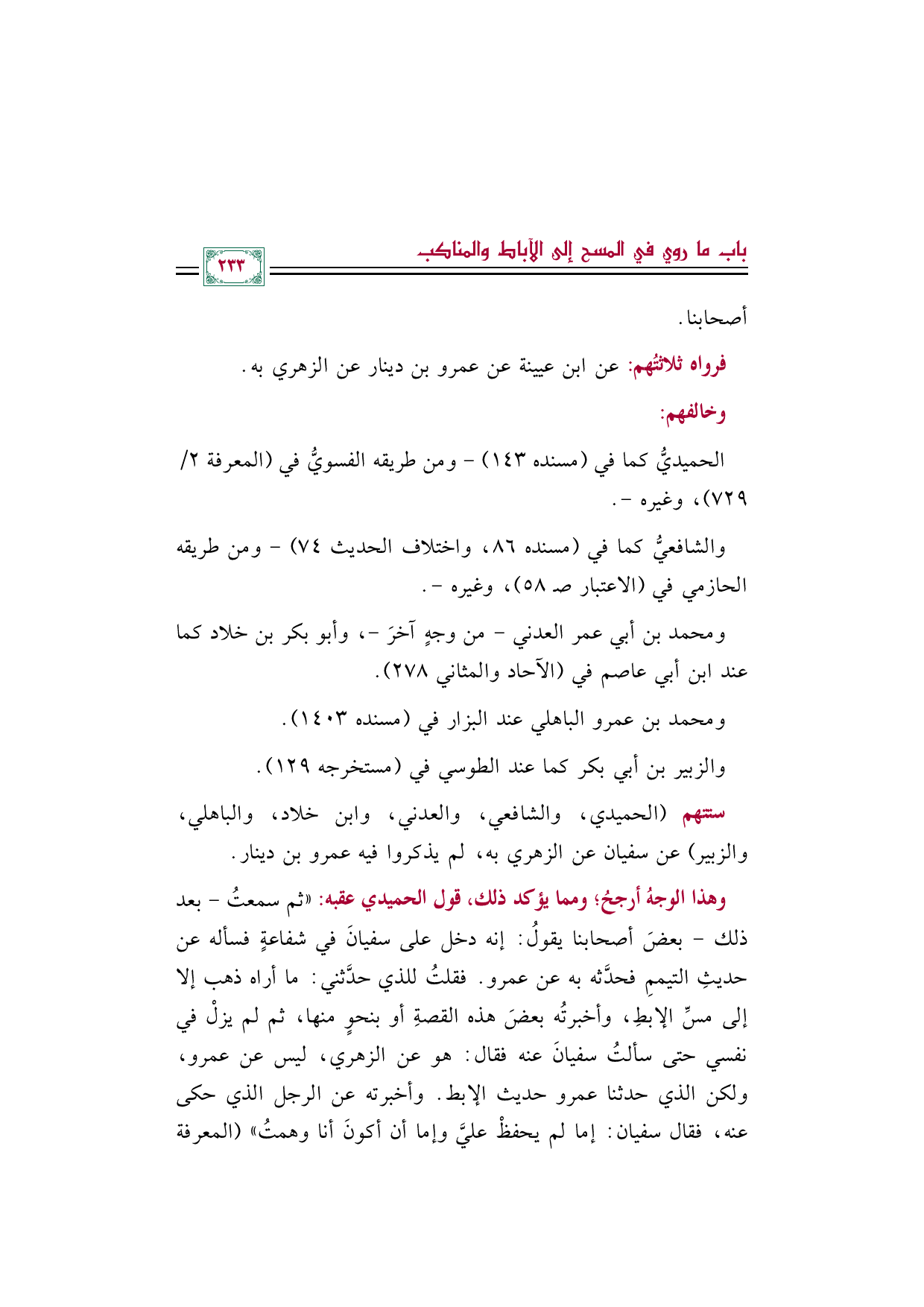 وهذا الوجهُ أرجحُ؛ ومما يؤكد ذلك، قول الحميدي عقبه: "ثم سمعتُ -بعد ذلك- بعضَ أصحابنا يقولُ: إنه دخل على سفيانَ في شفاعةٍ فسأله عن حديثِ التيممِ فحدَّثه به عن عمرو. فقلتُ للذي حدَّثني: ما أراه ذهب إلا إلى مسِّ الإبطِ، وأخبرتُه بعضَ هذه القصةِ أو بنحوٍ منها، ثم لم يزلْ في نفسي حتى سألتُ سفيانَ عنه فقال: هو عن الزهري، ليس عن عمرو، ولكن الذي حدثنا عمرو حديث الإبط. وأخبرته عن الرجل الذي حكى عنه، فقال سفيان: إما لم يحفظْ عليَّ وإما أن أكونَ أنا وهمتُ" (المعرفة