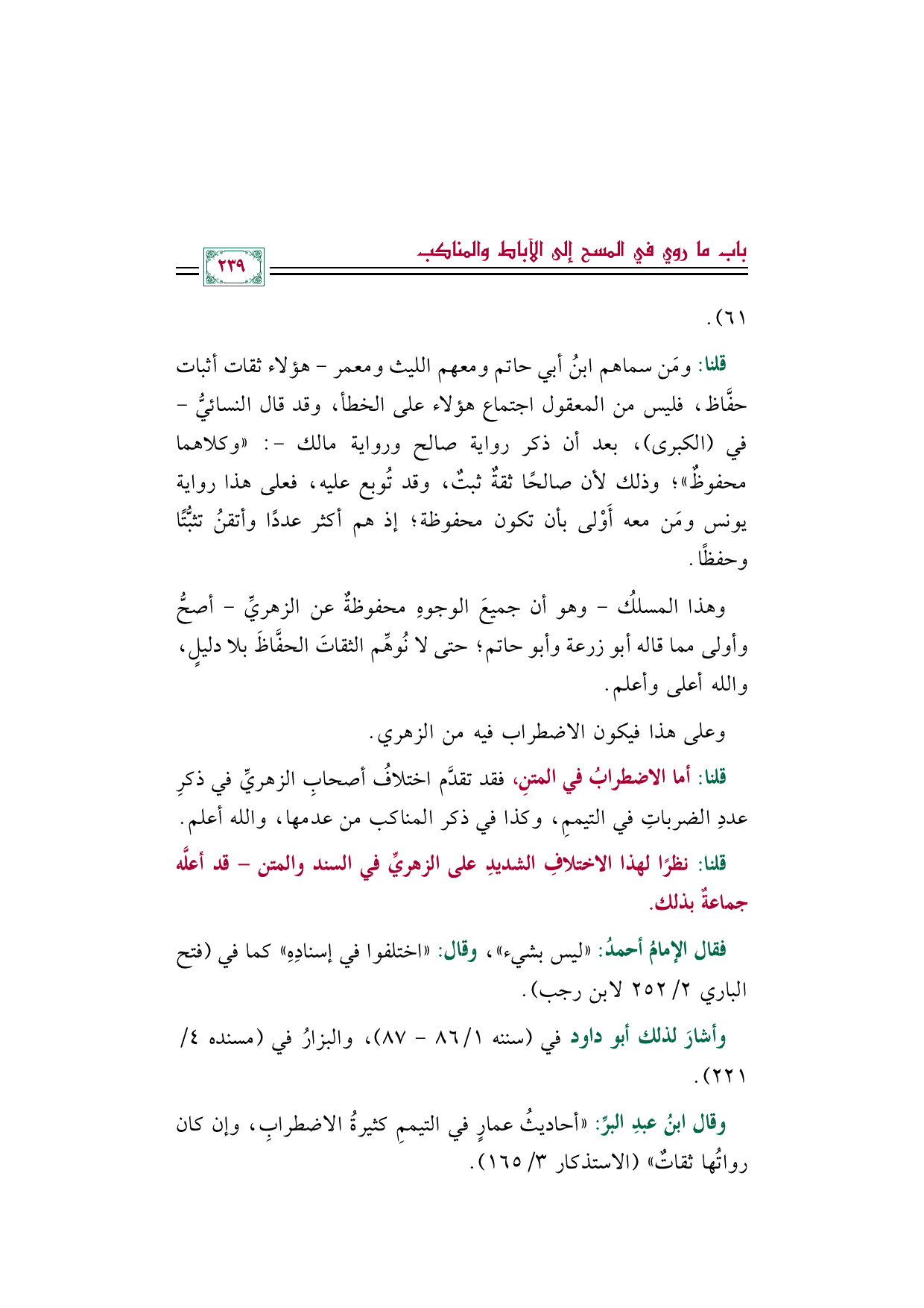 وهذا المسلكُ -وهو أن جميعَ الوجوهِ محفوظةٌ عن الزهريِّ- أصحُّ وأولى مما قاله أبو زرعة وأبو حاتم؛ حتى لا نُوهِّم الثقاتَ الحفَّاظَ بلا دليلٍ، والله أعلى وأعلم.