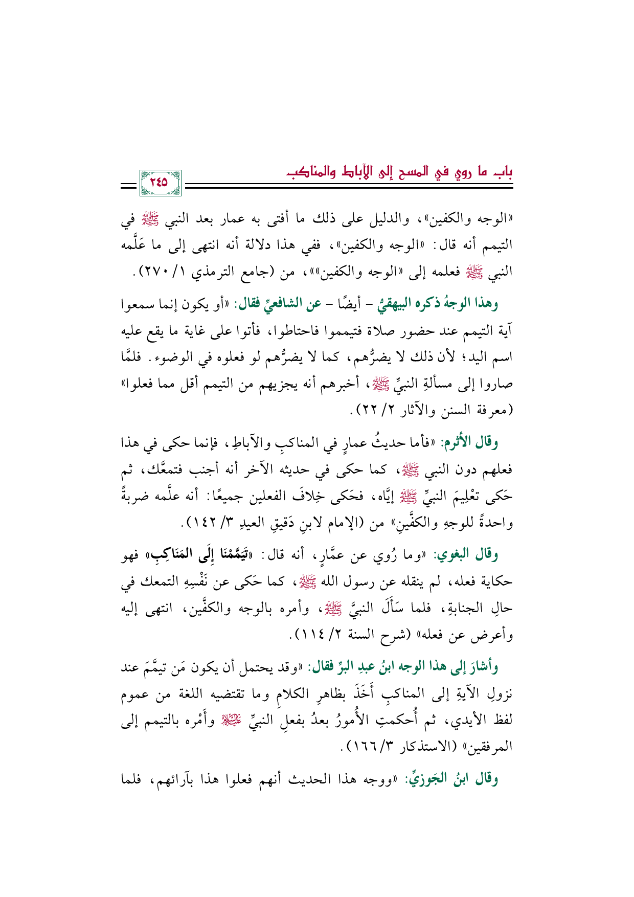 وهذا الوجهُ ذكره البيهقيُّ -أيضًا- عن الشافعيِّ فقال: "أو يكون إنما سمعوا آية التيمم عند حضور صلاة فتيمموا فاحتاطوا، فأتوا على غاية ما يقع عليه اسم اليد؛ لأن ذلك لا يضرُّهم، كما لا يضرُّهم لو فعلوه في الوضوء. فلمَّا صاروا إلى مسألةِ النبيِّ صلى الله عليه وسلم، أخبرهم أنه يجزيهم من التيمم أقل مما فعلوا" (معرفة السنن والآثار ٢/ ٢٢).