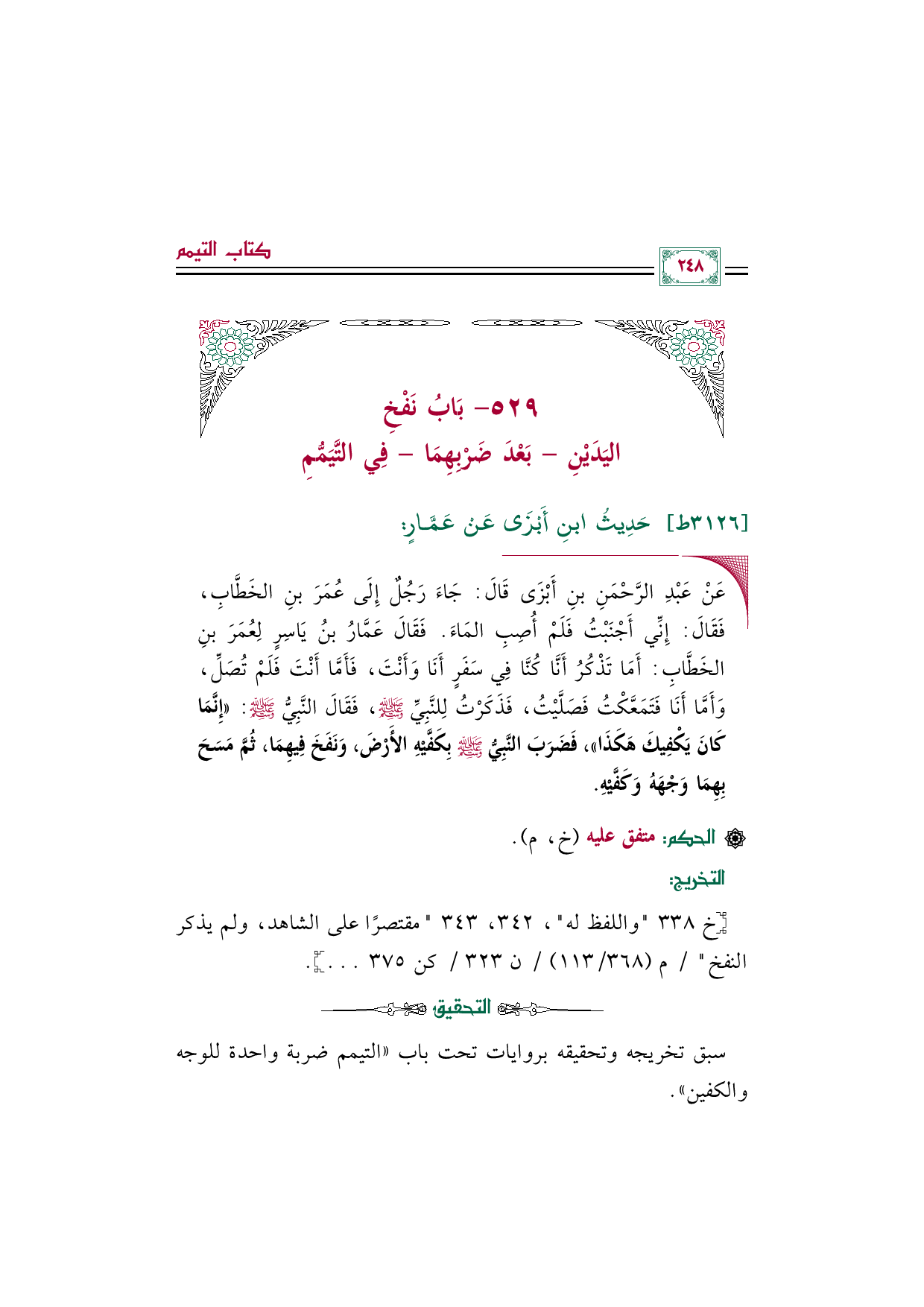 • عَنْ عَبْدِ الرَّحْمَنِ بنِ أَبْزَى قَالَ: جَاءَ رَجُلٌ إِلَى عُمَرَ بنِ الخَطَّابِ، فَقَالَ: إِنِّي أَجْنَبْتُ فَلَمْ أُصِبِ المَاءَ. فَقَالَ عَمَّارُ بنُ يَاسِرٍ لِعُمَرَ بنِ الخَطَّابِ: أَمَا تَذْكُرُ أَنَّا كُنَّا فِي سَفَرٍ أَنَا وَأَنْتَ، فَأَمَّا أَنْتَ فَلَمْ تُصَلِّ، وَأَمَّا أَنَا فَتَمَعَّكْتُ فَصَلَّيْتُ، فَذَكَرْتُ لِلنَّبِيِّ صلى الله عليه وسلم، فَقَالَ النَّبِيُّ صلى الله عليه وسلم: ((إِنَّمَا كَانَ يَكْفِيكَ هَكَذَا))، فَضَرَبَ النَّبِيُّ صلى الله عليه وسلم بِكَفَّيْهِ الأَرْضَ، وَنَفَخَ فِيهِمَا، ثُمَّ مَسَحَ بِهِمَا وَجْهَهُ وَكَفَّيْهِ.