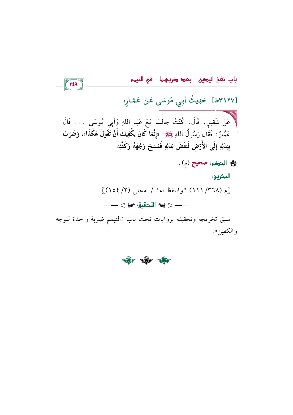◼ عَنْ شَقِيقٍ، قَالَ: كُنْتُ جالسًا مَعَ عَبْدِ اللهِ وَأَبِي مُوسَى ... قَالَ عَمَّارٌ: فَقَالَ رَسُولُ اللهِ صلى الله عليه وسلم: ((إِنَّمَا كَانَ يَكْفِيكَ أَنْ تَقُولَ هَكَذَا))، وَضَرَبَ بِيَدَيْهِ إِلَى الأَرْضِ فَنَفَضَ يَدَيْهِ فَمَسَحَ وَجْهَهُ وَكَفَّيْهِ.