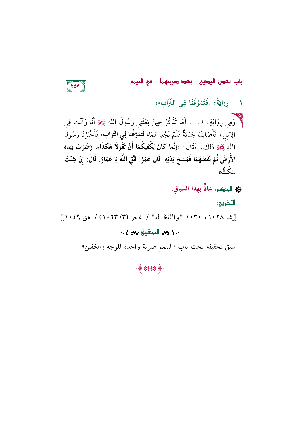 • وَفِي رِوَايَةٍ: (( ... أَمَا تَذْكُرُ حِينَ بَعَثَنِي رَسُولُ اللَّهِ صلى الله عليه وسلم أَنَا وَأَنْتَ فِي الإِبِلِ، فَأَصَابَتْنَا جَنَابَةٌ فَلَمْ نَجْدِ المَاءَ فَتَمَرَّغْنَا فِي التُّرَابِ، فَأَخْبَرْنَا رَسُولَ اللَّهِ صلى الله عليه وسلم ذَلِكَ، فَقَالَ: ((إِنَّمَا كَانَ يَكْفِيكُمَا أَنْ تَقُولَا هَكَذَا))، وَضَرَبَ بِيَدِهِ الأَرْضَ ثُمَّ نَفَضَهُمَا فَمَسَحَ يَدَيْهِ. قَالَ عُمَرُ: اتَّقِ اللَّهَ يَا عَمَّارُ. قَالَ: إِنْ شِئْتَ سَكَتُّ)).