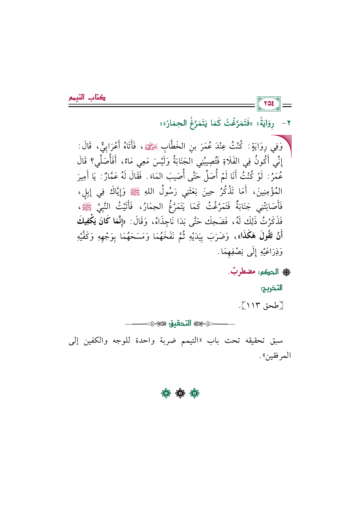 • وَفِي رِوَايَةٍ: كُنْتُ عِنْدَ عُمَرَ بنِ الخَطَّابِ رضي الله عنه، فَأَتَاهُ أَعْرَابِيٌّ، قَالَ: إِنِّي أَكُونُ فِي الفَلَاةِ فَتُصِيبُنِي الجَنَابَةُ وَلَيْسَ مَعِي مَاءٌ، أَفَأُصَلِّي؟ قَالَ عُمَرُ: لَوْ كُنْتُ أَنَا لَمْ أُصَلِّ حَتَّى أُصَيبَ المَاءَ. فَقَالَ لَهُ عَمَّارٌ: يَا أَمِيرَ المُؤْمِنِينَ، أَمَا تَذْكُرُ حِينَ بَعَثَنِي رَسُولُ اللهِ صلى الله عليه وسلم وَإِيَّاكَ فِي إِبِلٍ، فَأَصَابَتْنِي جَنَابَةٌ فَتَمَرَّغْتُ كَمَا يَتَمَرَّغُ الحِمَارُ، فَأَتَيْتُ النَّبِيَّ صلى الله عليه وسلم، فَذَكَرْتُ ذَلِكَ لَهُ، فَضَحِكَ حَتَّى بَدَا نَاجِذَاهُ، وَقَالَ: ((إِنَّمَا كَانَ يَكْفِيكَ أَنْ تَقُولَ هَكَذَا))، وَضَرَبَ بِيَدَيْهِ ثُمَّ نَفَخَهُمَا وَمَسَحَهُمَا بِوَجْهِهِ وَكَفَّيْهِ وَذِرَاعَيْهِ إِلَى نِصْفِهِمَا.
