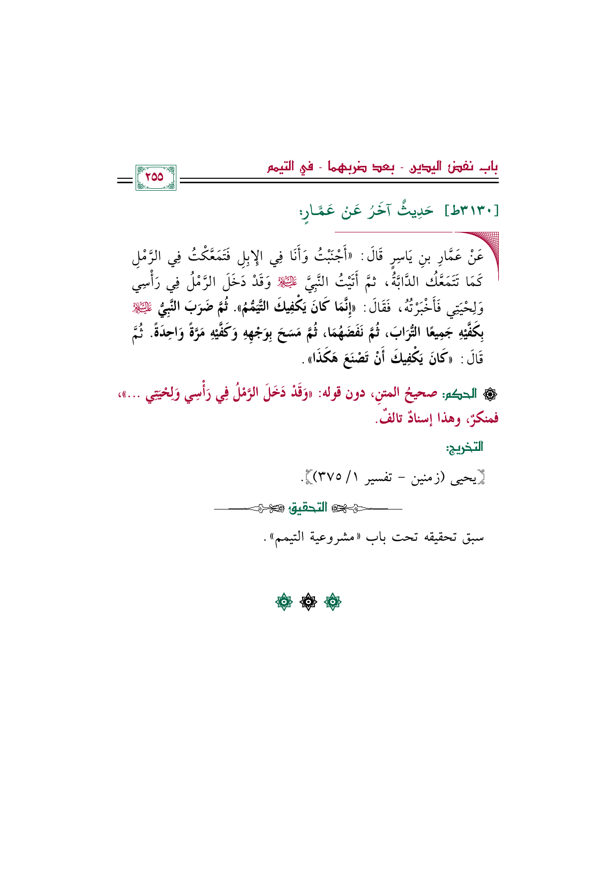 ◼ عَنْ عَمَّارِ بنِ يَاسِرٍ قَالَ: ((أَجْنَبْتُ وَأَنَا فِي الإِبِلِ فَتَمَعَّكْتُ فِي الرَّمْلِ كَمَا تَتَمَعَّكُ الدَّابَّةُ، ثمَّ أَتَيْتُ النَّبِيَّ عَلَيْهِ السَّلَامُ وَقَدْ دَخَلَ الرَّمْلُ فِي رَأْسِي وَلِحْيَتِي فَأَخْبَرْتُهُ، فَقَالَ: ((إِنَّمَا كَانَ يَكْفِيكَ التَّيَمُّمُ)). ثُمَّ ضَرَبَ النَّبِيُّ عَلَيْهِ السَّلَامُ بِكَفَّيْهِ جَمِيعًا التُّرَابَ، ثُمَّ نَفَضَهُمَا، ثُمَّ مَسَحَ بِوَجْهِهِ وَكَفَّيْهِ مَرَّةً وَاحِدَةً. ثُمَّ قَالَ: ((كَانَ يَكْفِيكَ أَنْ تَصْنَعَ هَكَذَا)).