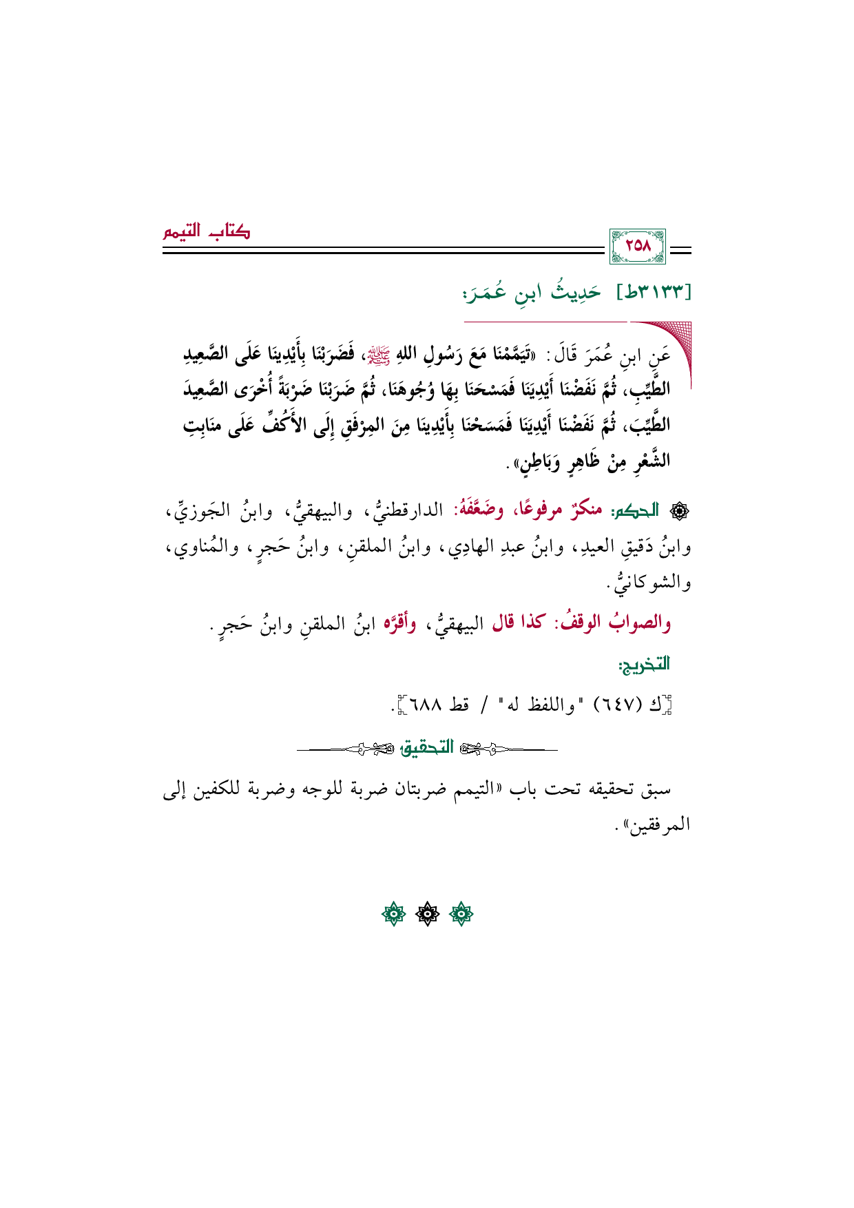 ◼ عَنِ ابنِ عُمَرَ قَالَ: ((تَيَمَّمْنَا مَعَ رَسُولِ اللهِ صلى الله عليه وسلم، فَضَرَبْنَا بِأَيْدِينَا عَلَى الصَّعِيدِ الطَّيِّبِ، ثُمَّ نَفَضْنَا أَيْدِيَنَا فَمَسْحَنَا بِهَا وُجُوهَنَا، ثُمَّ ضَرَبْنَا ضَرْبَةً أُخْرَى الصَّعِيدَ الطَّيِّبَ، ثُمَّ نَفَضْنَا أَيْدِيَنَا فَمَسَحْنَا بِأَيْدِينَا مِنَ المِرْفَقِ إِلَى الأَكُفِّ عَلَى منَابِتِ الشَّعْرِ مِنْ ظَاهِرٍ وَبَاطِنٍ)).