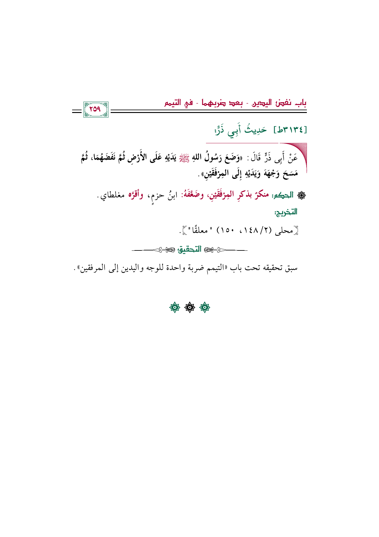 سبق تحقيقه تحت باب "التيمم ضربة واحدة للوجه واليدين إلى المرفقين".