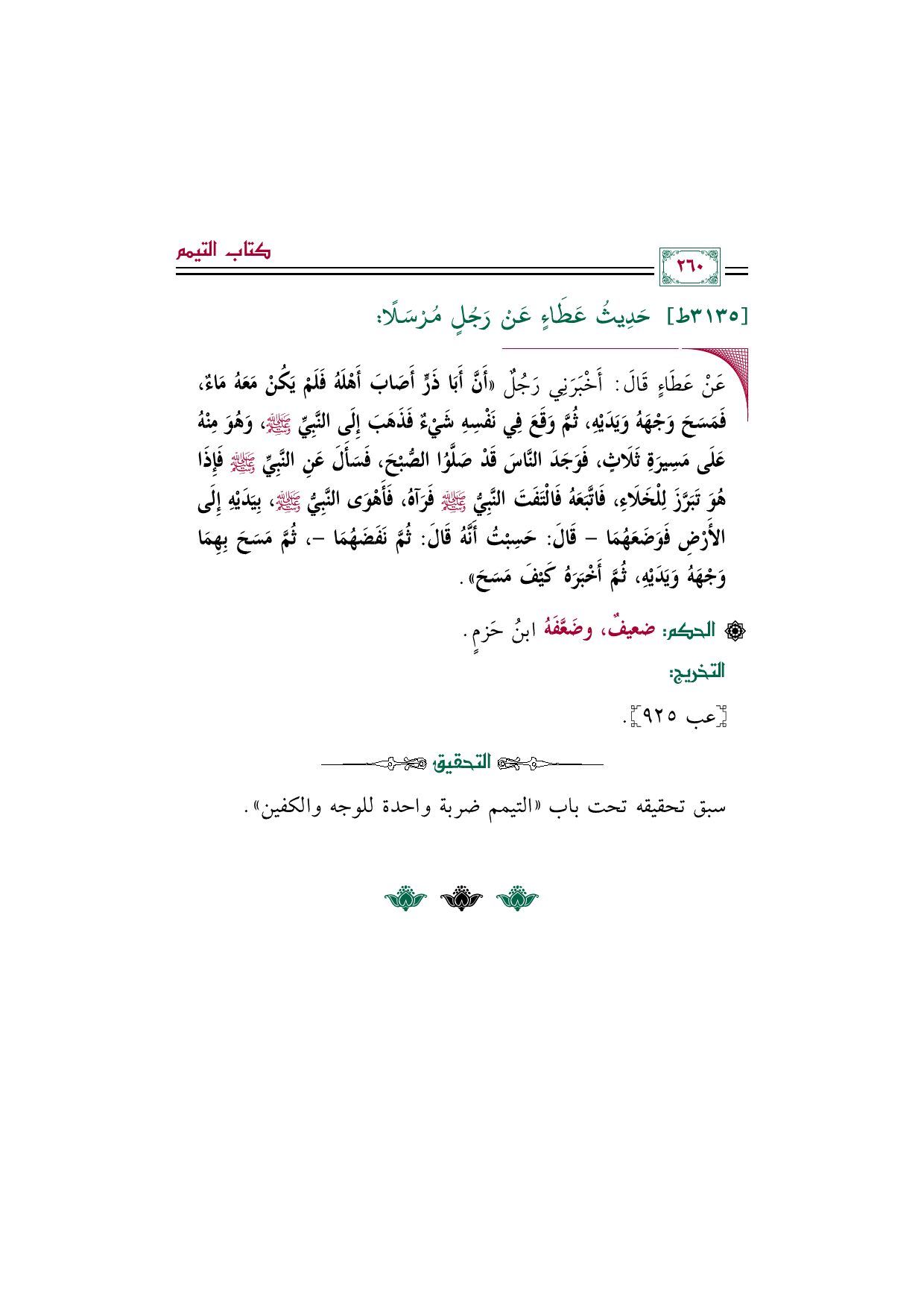 ◼ عَنْ عَطَاءٍ قَالَ: أَخْبَرَنِي رَجُلٌ ((أَنَّ أَبَا ذَرٍّ أَصَابَ أَهْلَهُ فَلَمْ يَكُنْ مَعَهُ مَاءٌ، فَمَسَحَ وَجْهَهُ وَيَدَيْهِ، ثُمَّ وَقَعَ فِي نَفْسِهِ شَيْءٌ فَذَهَبَ إِلَى النَّبِيِّ صلى الله عليه وسلم، وَهُوَ مِنْهُ عَلَى مَسِيرَةِ ثَلَاثٍ، فَوَجَدَ النَّاسَ قَدْ صَلَّوُا الصُّبْحَ، فَسَأَلَ عَنِ النَّبِيِّ صلى الله عليه وسلم فَإِذَا هُوَ تَبَرَّزَ لِلْخَلَاءِ، فَاتَّبَعَهُ فَالْتَفَتَ النَّبِيُّ صلى الله عليه وسلم فَرَآهُ، فَأَهْوَى النَّبِيُّ صلى الله عليه وسلم، بِيَدَيْهِ إِلَى الأَرْضِ فَوَضَعَهُمَا -قَالَ: حَسِبْتُ أَنَّهُ قَالَ: ثُمَّ نَفَضَهُمَا-، ثُمَّ مَسَحَ بِهِمَا وَجْهَهُ وَيَدَيْهِ، ثُمَّ أَخْبَرَهُ كَيْفَ مَسَحَ)).