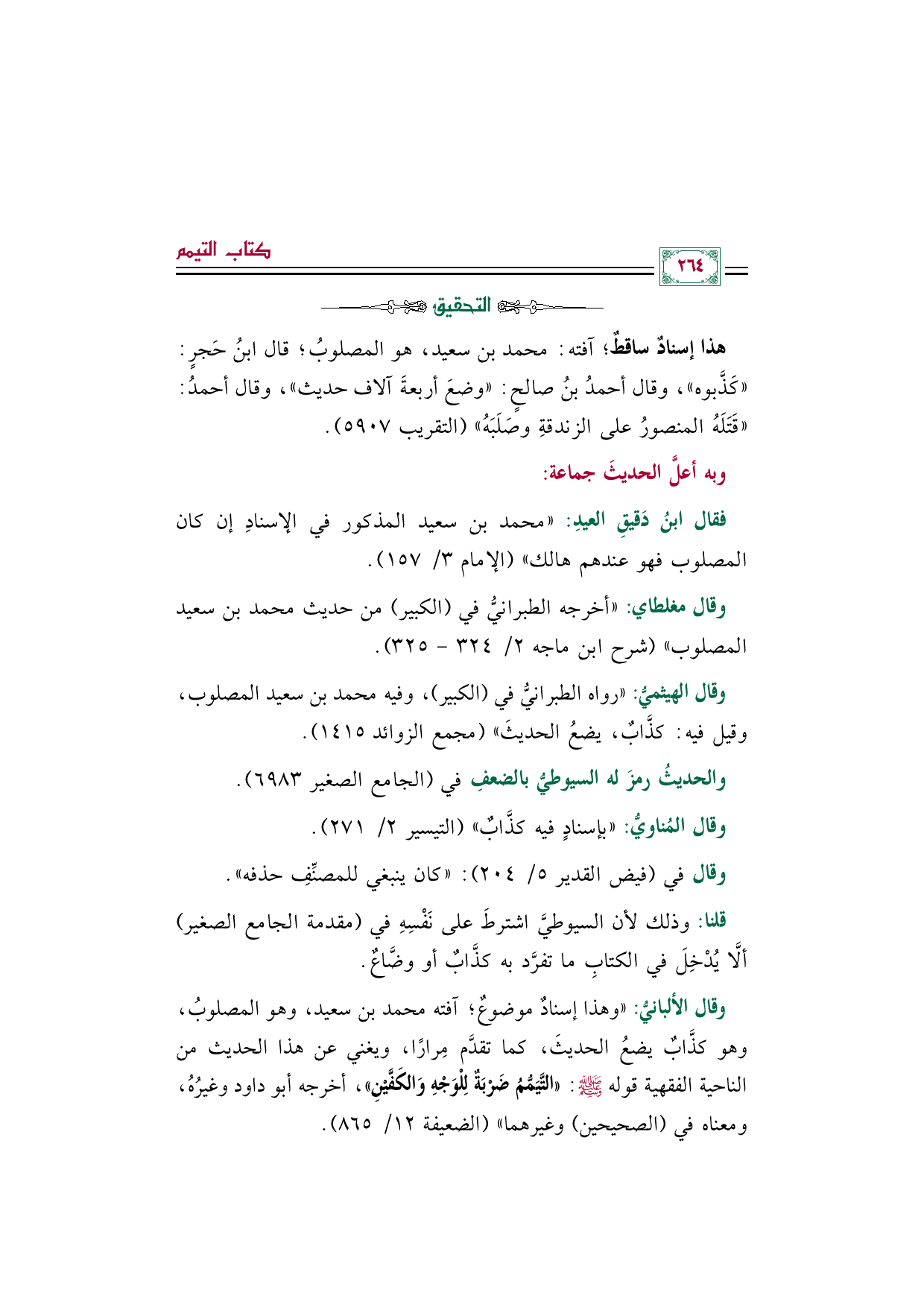 وقال الألبانيُّ: "وهذا إسنادٌ موضوعٌ؛ آفته محمد بن سعيد، وهو المصلوبُ، وهو كذَّابٌ يضعُ الحديثَ، كما تقدَّم مِرارًا، ويغني عن هذا الحديث من الناحية الفقهية قوله صلى الله عليه وسلم: ((التَّيَمُّمُ ضَرْبَةٌ لِلْوَجْهِ وَالكَفَّيْنِ))، أخرجه أبو داود وغيرُهُ، ومعناه في (الصحيحين) وغيرهما" (الضعيفة ١٢/ ٨٦٥).