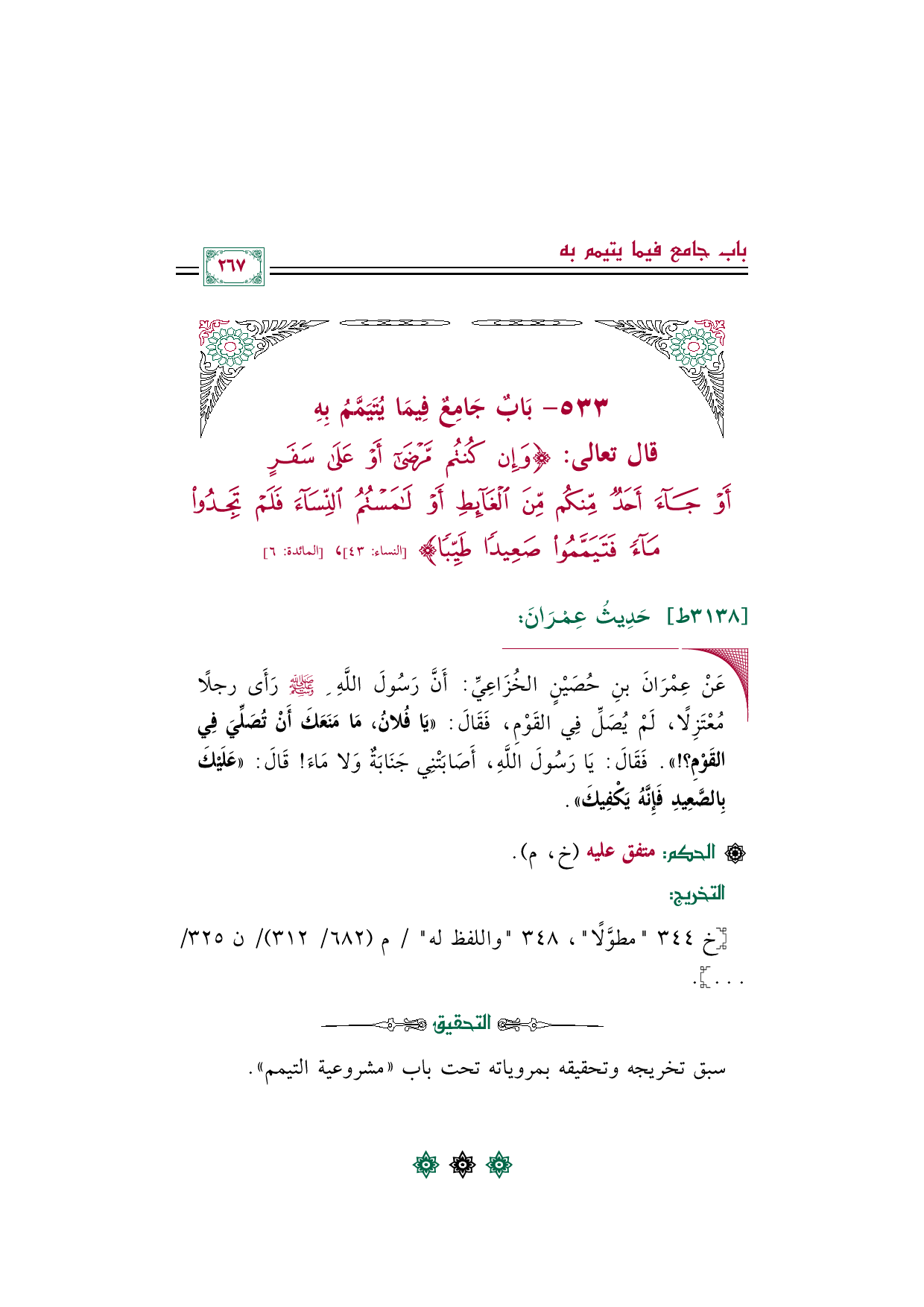 ◼ عَنْ عِمْرَانَ بنِ حُصَيْنٍ الخُزَاعِيِّ: أَنَّ رَسُولَ اللَّهِ صلى الله عليه وسلم رَأَى رجلًا مُعْتَزِلًا، لَمْ يُصَلِّ فِي القَوْمِ، فَقَالَ: ((يَا فُلانُ، مَا مَنَعَكَ أَنْ تُصَلِّيَ فِي القَوْمِ؟ ! )). فَقَالَ: يَا رَسُولَ اللَّهِ، أَصَابَتْنِي جَنَابَةٌ وَلا مَاءَ! قَالَ: ((عَلَيْكَ بِالصَّعِيدِ فَإِنَّهُ يَكْفِيكَ)).