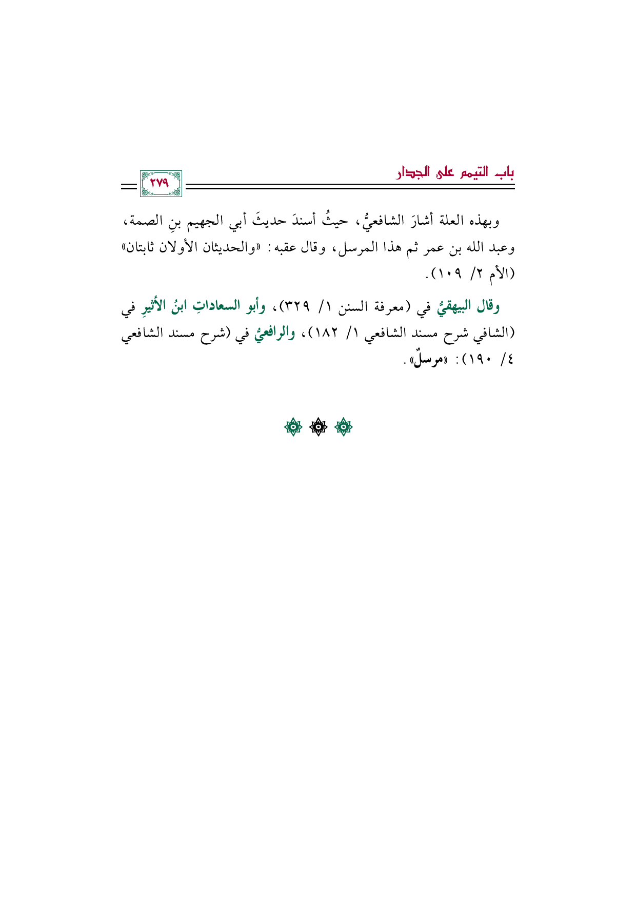 وبهذه العلة أشارَ الشافعيُّ، حيثُ أسندَ حديثَ أبي الجهيم بنِ الصمة، وعبد الله بن عمر ثم هذا المرسل، وقال عقبه: "والحديثان الأولان ثابتان" (الأم ٢/ ١٠٩).