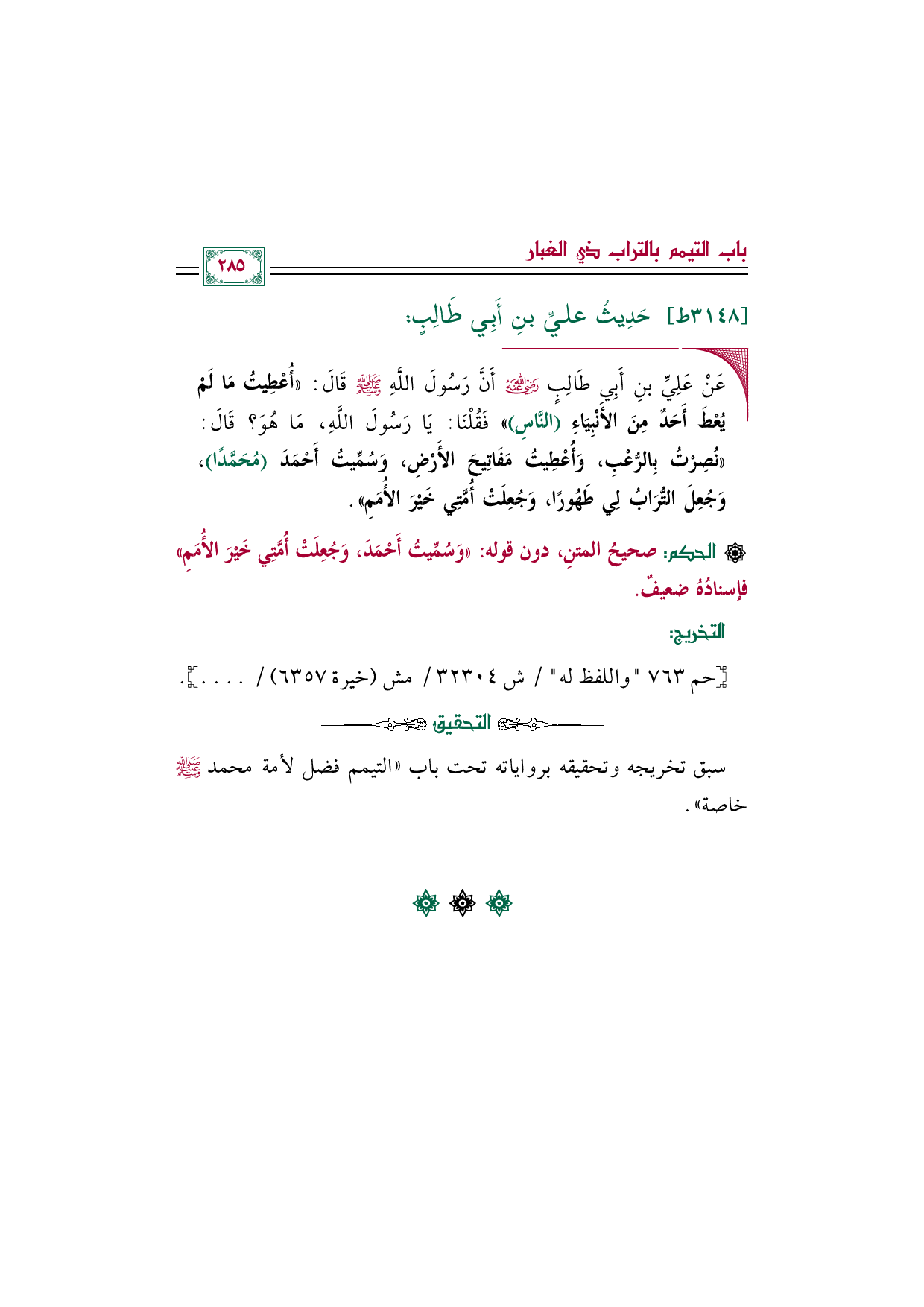 ◼ عَنْ عَلِيِّ بنِ أَبِي طَالِبٍ رضي الله عنه أَنَّ رَسُولَ اللَّهِ صلى الله عليه وسلم قَالَ: ((أُعْطِيتُ مَا لَمْ يُعْطَ أَحَدٌ مِنَ الأَنْبِيَاءِ (النَّاسِ))) فَقُلْنَا: يَا رَسُولَ اللَّهِ، مَا هُوَ؟ قَالَ: ((نُصِرْتُ بِالرُّعْبِ، وَأُعْطِيتُ مَفَاتِيحَ الأَرْضِ، وَسُمِّيتُ أَحْمَدَ (مُحَمَّدًا)، وَجُعِلَ التُّرَابُ لِي طَهُورًا، وَجُعِلَتْ أُمَّتِي خَيْرَ الأُمَمِ)).