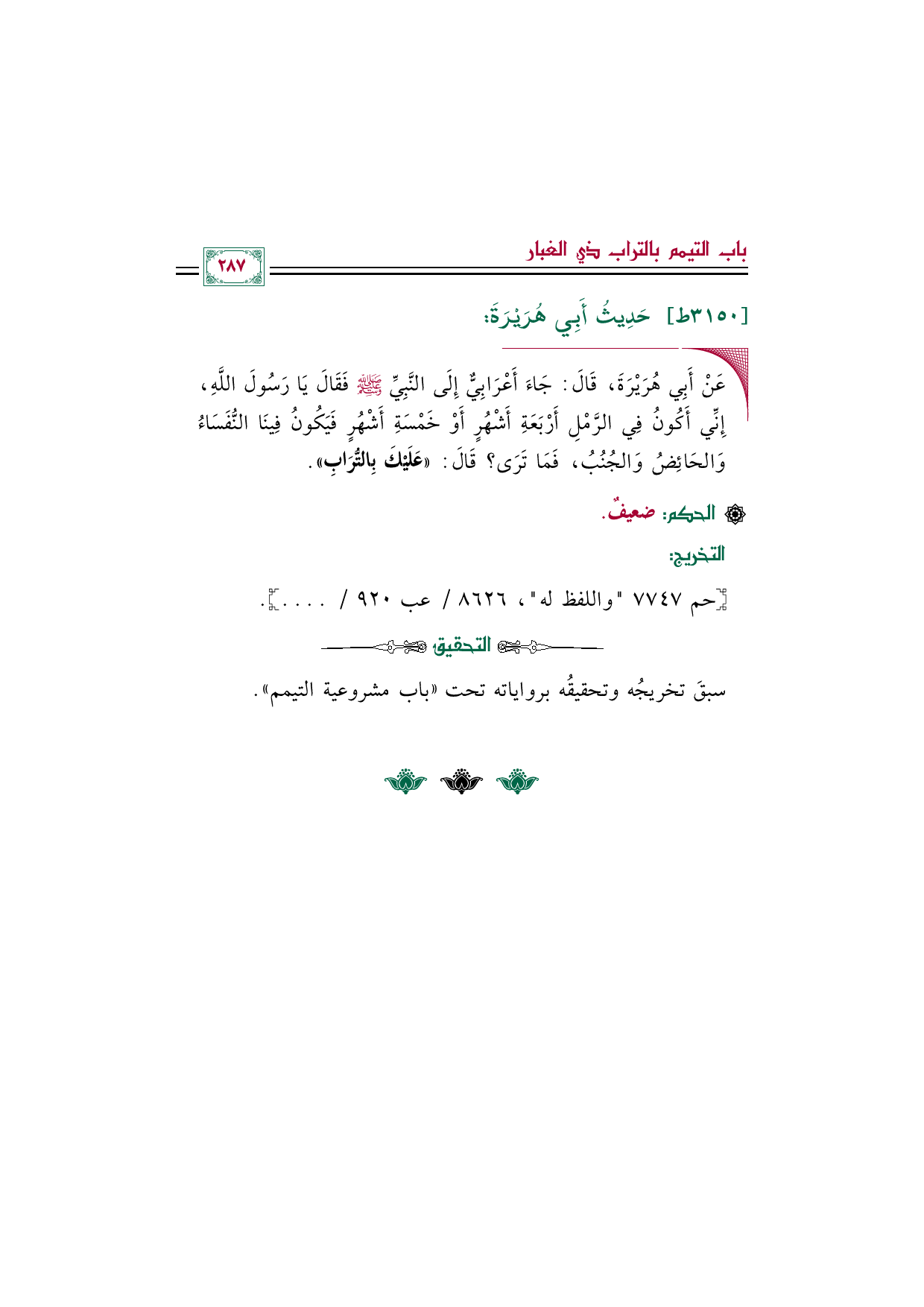 ◼ عَنْ أَبِي هُرَيْرَةَ، قَالَ: جَاءَ أَعْرَابِيٌّ إِلَى النَّبِيِّ صلى الله عليه وسلم فَقَالَ يَا رَسُولَ اللَّهِ، إِنِّي أَكُونُ فِي الرَّمْلِ أَرْبَعَةِ أَشْهُرٍ أَوْ خَمْسَةِ أَشْهُرٍ فَيَكُونُ فِينَا النُّفَسَاءُ وَالحَائِضُ وَالجُنُبُ، فَمَا تَرَى؟ قَالَ: ((عَلَيْكَ بِالتُّرَابِ)).