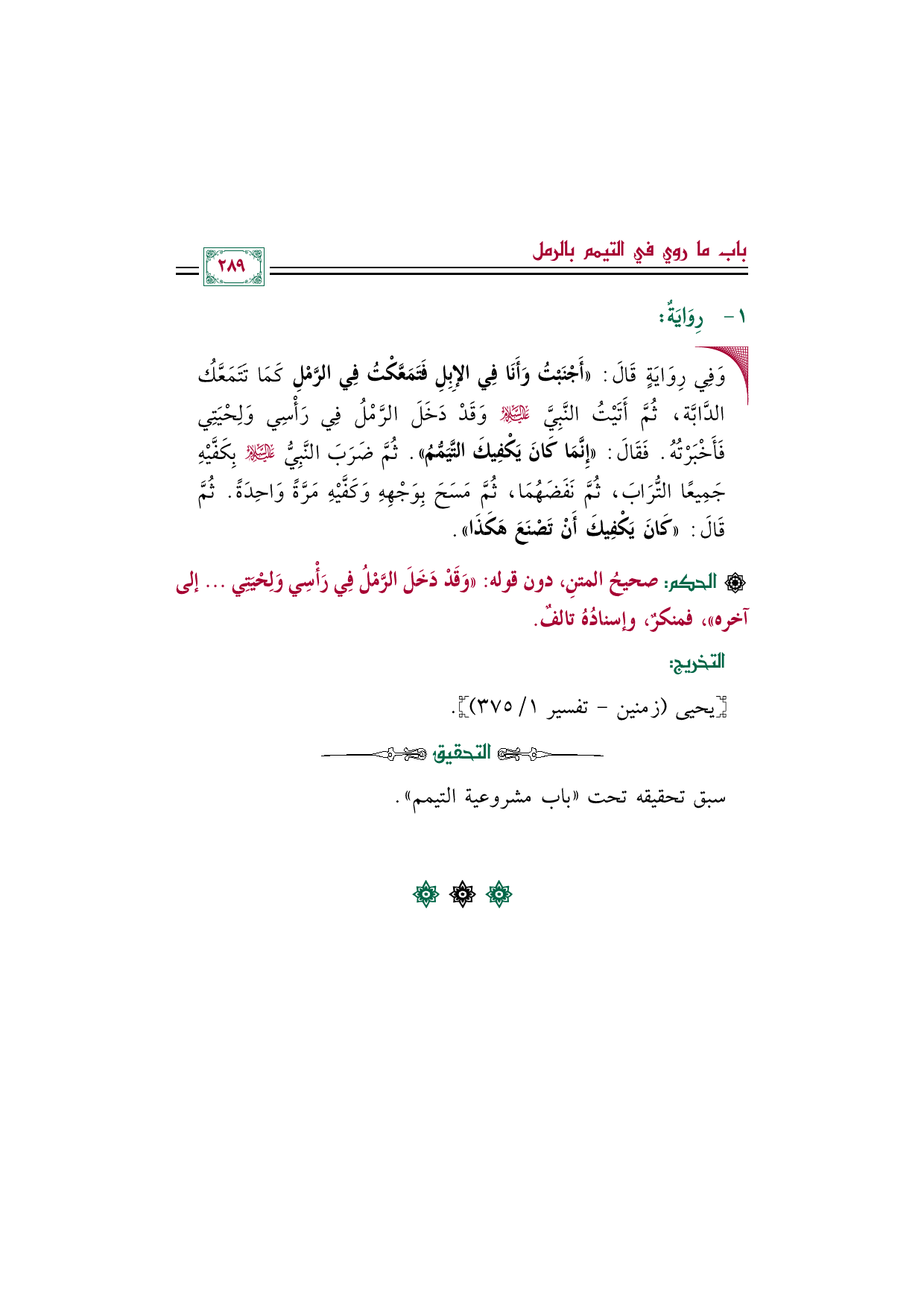 • وَفِي رِوَايَةٍ قَالَ: ((أَجْنَبْتُ وَأَنَا فِي الإِبِلِ فَتَمَعَّكْتُ فِي الرَّمْلِ كَمَا تَتَمَعَّكُ الدَّابَّة، ثُمَّ أَتَيْتُ النَّبِيَّ عَلَيْهِ السَّلَامُ وَقَدْ دَخَلَ الرَّمْلُ فِي رَأْسِي وَلِحْيَتِي فَأَخْبَرْتُهُ. فَقَالَ: ((إِنَّمَا كَانَ يَكْفِيكَ التَّيَمُّمُ)). ثُمَّ ضَرَبَ النَّبِيُّ عَلَيْهِ السَّلَامُ بِكَفَّيْهِ جَمِيعًا التُّرَابَ، ثُمَّ نَفَضَهُمَا، ثُمَّ مَسَحَ بِوَجْهِهِ وَكَفَّيْهِ مَرَّةً وَاحِدَةً. ثُمَّ قَالَ: ((كَانَ يَكْفِيكَ أَنْ تَصْنَعَ هَكَذَا)).