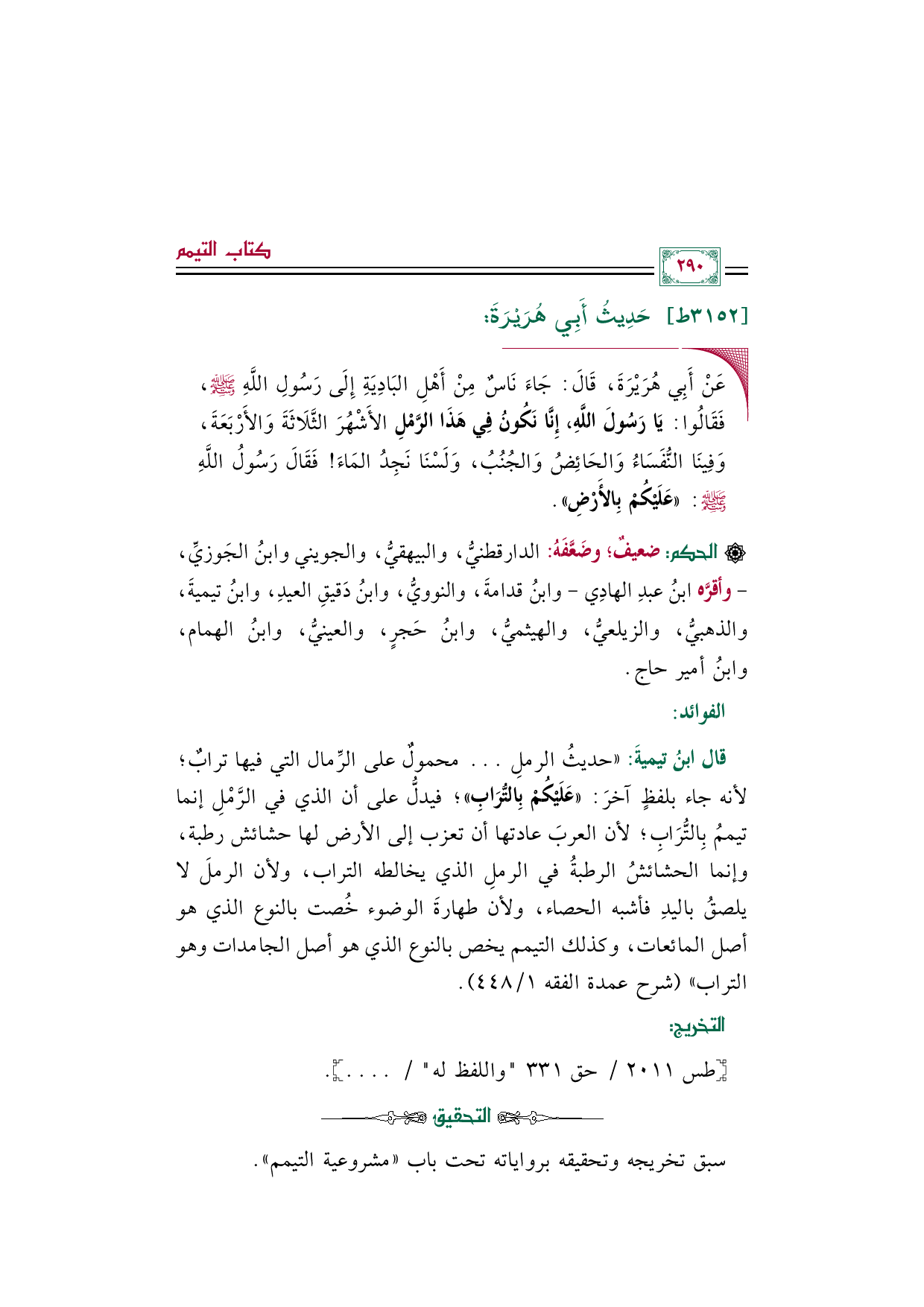 قال ابنُ تيميةَ: "حديثُ الرملِ ... محمولٌ على الرِّمال التي فيها ترابٌ؛ لأنه جاء بلفظٍ آخرَ: ((عَلَيْكُمْ بِالتُّرَابِ))؛ فيدلُّ على أن الذي في الرَّمْلِ إنما تيممُ بِالتُّرَابِ؛ لأن العربَ عادتها أن تعزب إلى الأرض لها حشائش رطبة، وإنما الحشائشُ الرطبةُ في الرملِ الذي يخالطه التراب، ولأن الرملَ لا يلصقُ باليدِ فأشبه الحصاء، ولأن طهارةَ الوضوء خُصت بالنوع الذي هو أصل المائعات، وكذلك التيمم يخص بالنوع الذي هو أصل الجامدات وهو التراب" (شرح عمدة الفقه ١/ ٤٤٨).