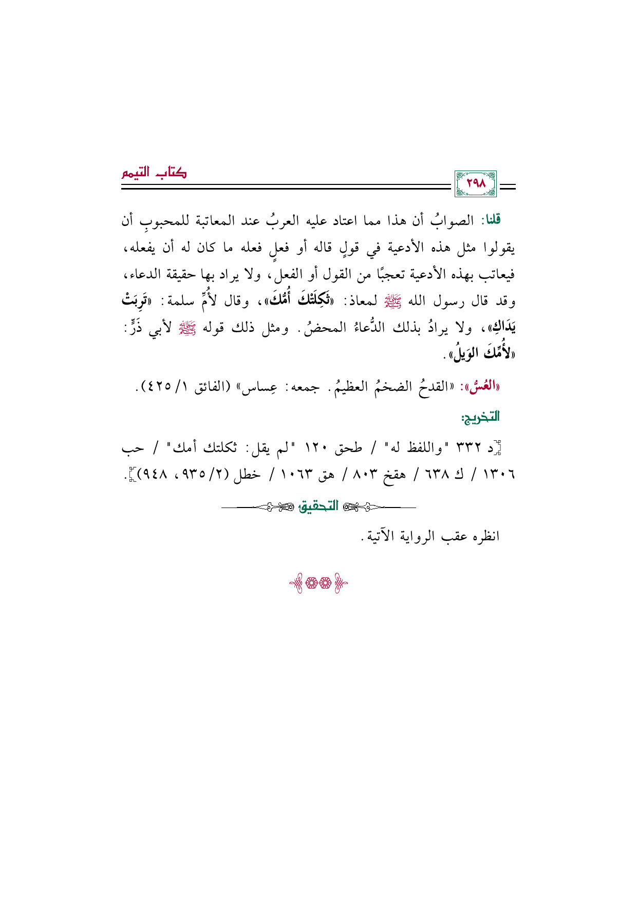 قلنا: الصوابُ أن هذا مما اعتاد عليه العربُ عند المعاتبة للمحبوبِ أن يقولوا مثل هذه الأدعية في قولٍ قاله أو فعلٍ فعله ما كان له أن يفعله، فيعاتب بهذه الأدعية تعجبًا من القول أو الفعل، ولا يراد بها حقيقة الدعاء، وقد قال رسول الله صلى الله عليه وسلم لمعاذ: ((ثَكِلَتْكَ أُمُّكَ))، وقال لأُمِّ سلمة: ((تَرِبَتْ يَدَاكِ))، ولا يرادُ بذلك الدُّعاءُ المحضُ. ومثل ذلك قوله صلى الله عليه وسلم لأبي ذَرٍّ: ((لأُمِّكَ الوَيلُ)).