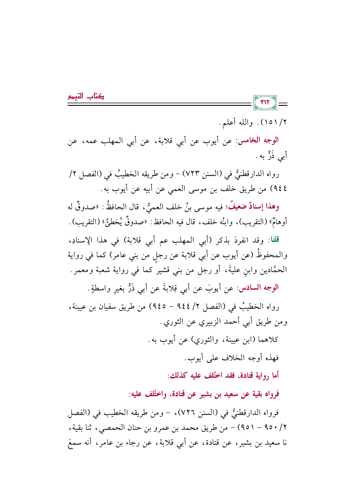 رواه الدارقطنيُّ في (السنن ٧٢٣) -ومن طريقه الخطيبُ في (الفصل ٢/ ٩٤٤) من طريق خلف بن موسى العمي عن أبيه عن أيوب به.