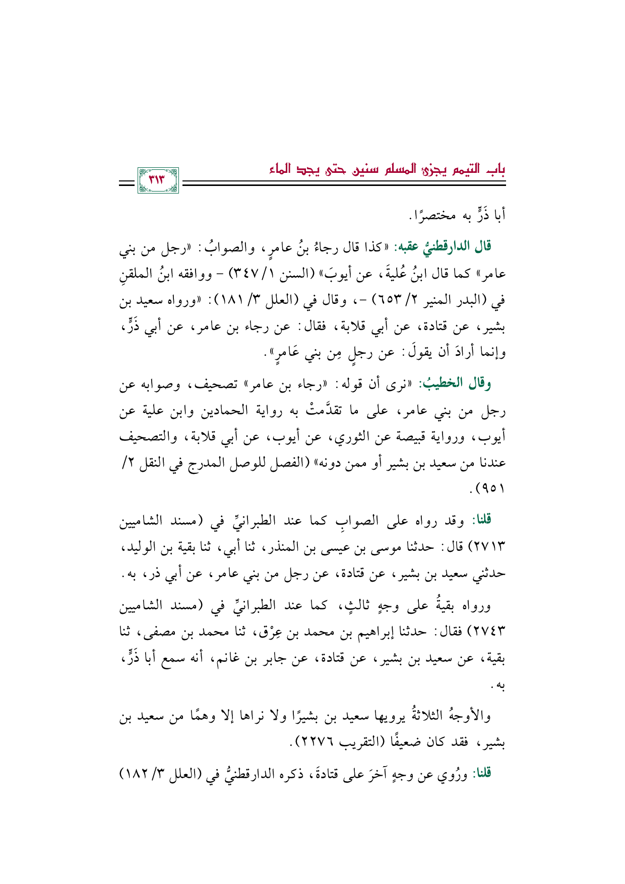 قال الدارقطنيُّ عقبه: "كذا قال رجاءُ بنُ عامرٍ، والصوابُ: (رجل من بني عامر) كما قال ابنُ عُليةَ، عن أيوبَ" (السنن ١/ ٣٤٧) -ووافقه ابنُ الملقنِ في (البدر المنير ٢/ ٦٥٣) -، وقال في (العلل ٣/ ١٨١): "ورواه سعيد بن بشير، عن قتادة، عن أبي قلابة، فقال: عن رجاء بن عامر، عن أبي ذَرٍّ، وإنما أرادَ أن يقولَ: عن رجلٍ مِن بني عَامرٍ".