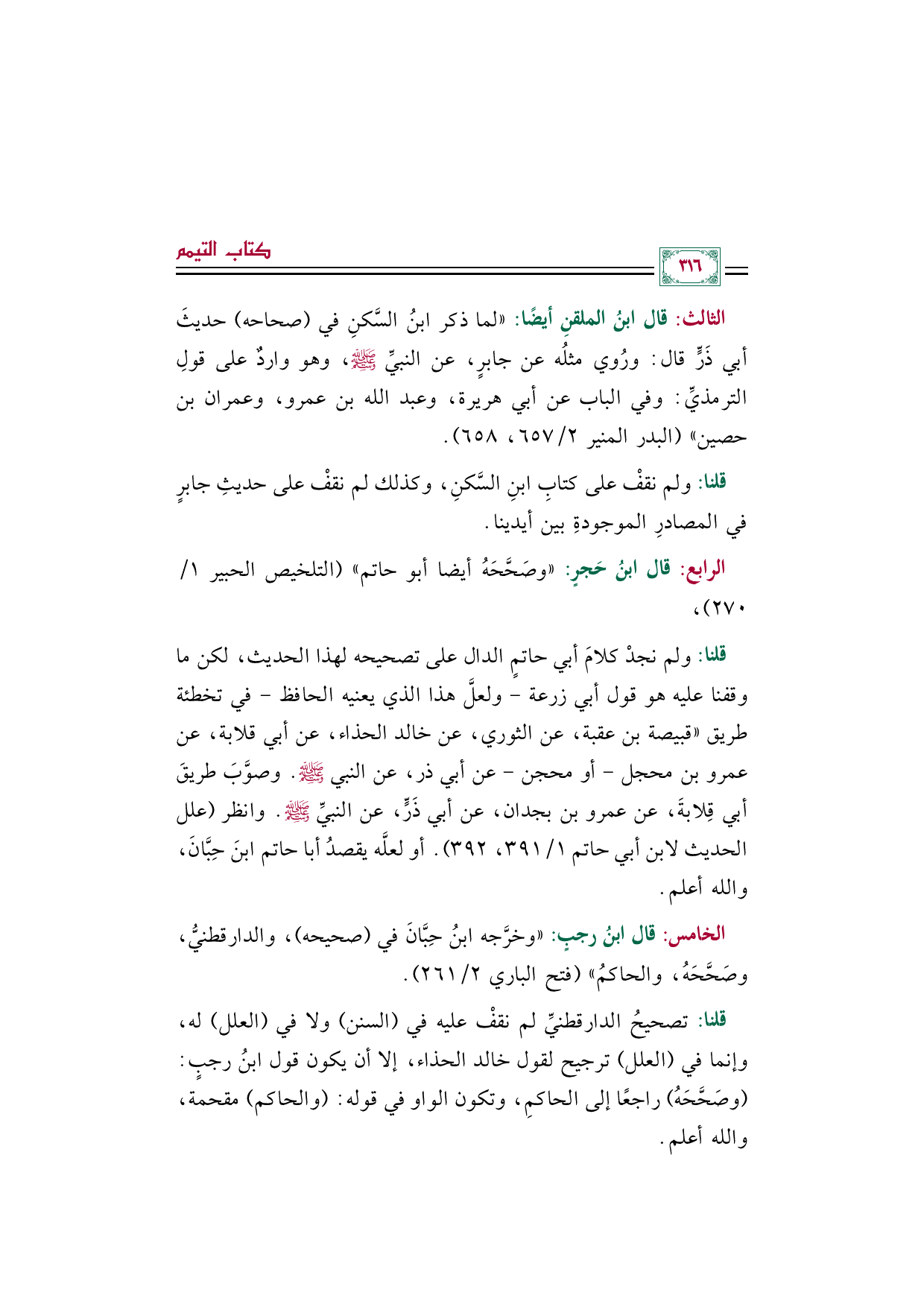 الثالث: قال ابنُ الملقنِ أيضًا: "لما ذكر ابنُ السَّكنِ في (صحاحه) حديثَ أبي ذَرٍّ قال: ورُوي مثلُه عن جابرٍ، عن النبيِّ صلى الله عليه وسلم، وهو واردٌ على قولِ الترمذيِّ: وفي الباب عن أبي هريرة، وعبد الله بن عمرو، وعمران بن حصين" (البدر المنير ٢/ ٦٥٧، ٦٥٨).