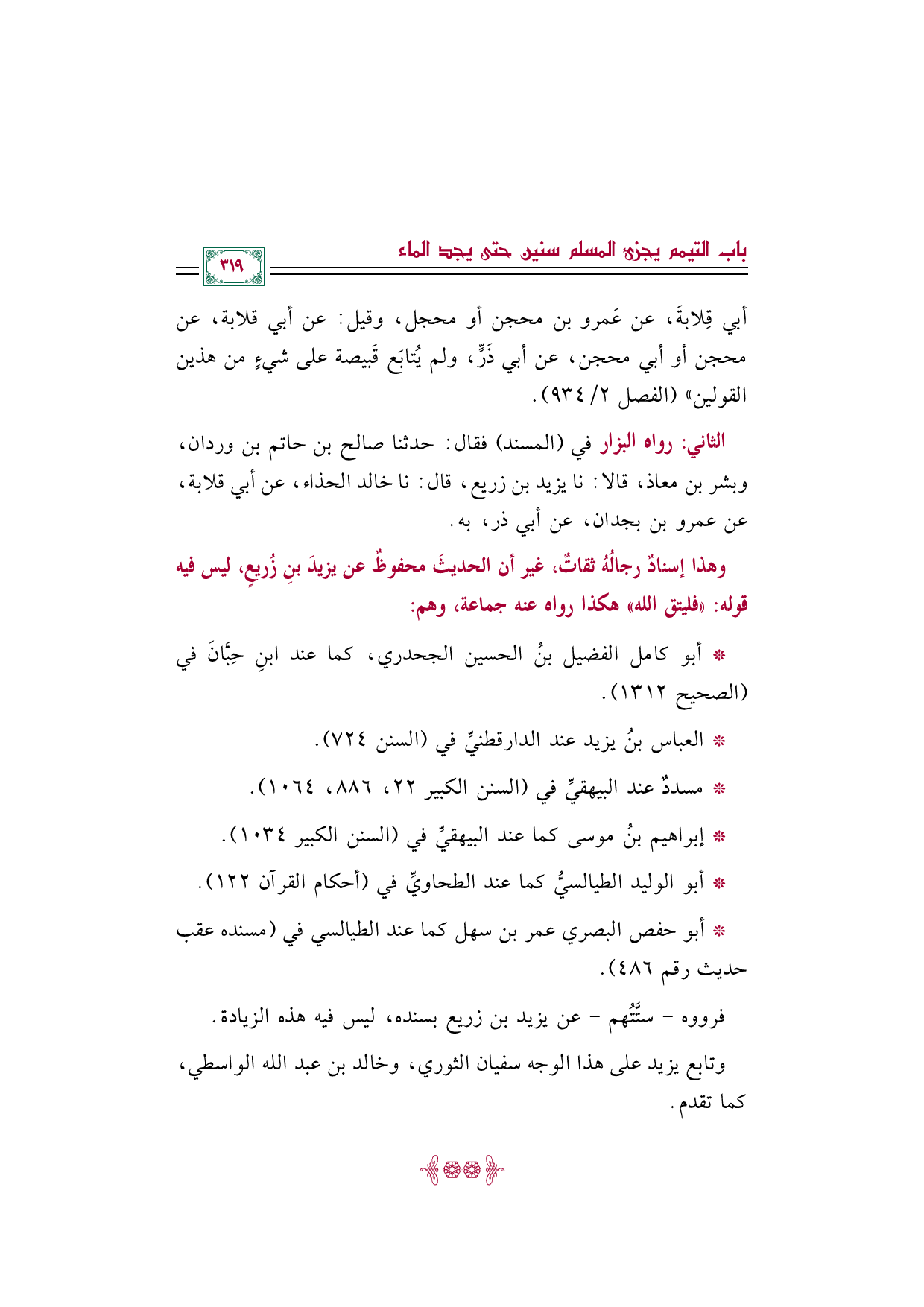 الثاني: رواه البزار في (المسند) فقال: حدثنا صالح بن حاتم بن وردان، وبشر بن معاذ، قالا: نا يزيد بن زريع، قال: نا خالد الحذاء، عن أبي قلابة، عن عمرو بن بجدان، عن أبي ذر، به.