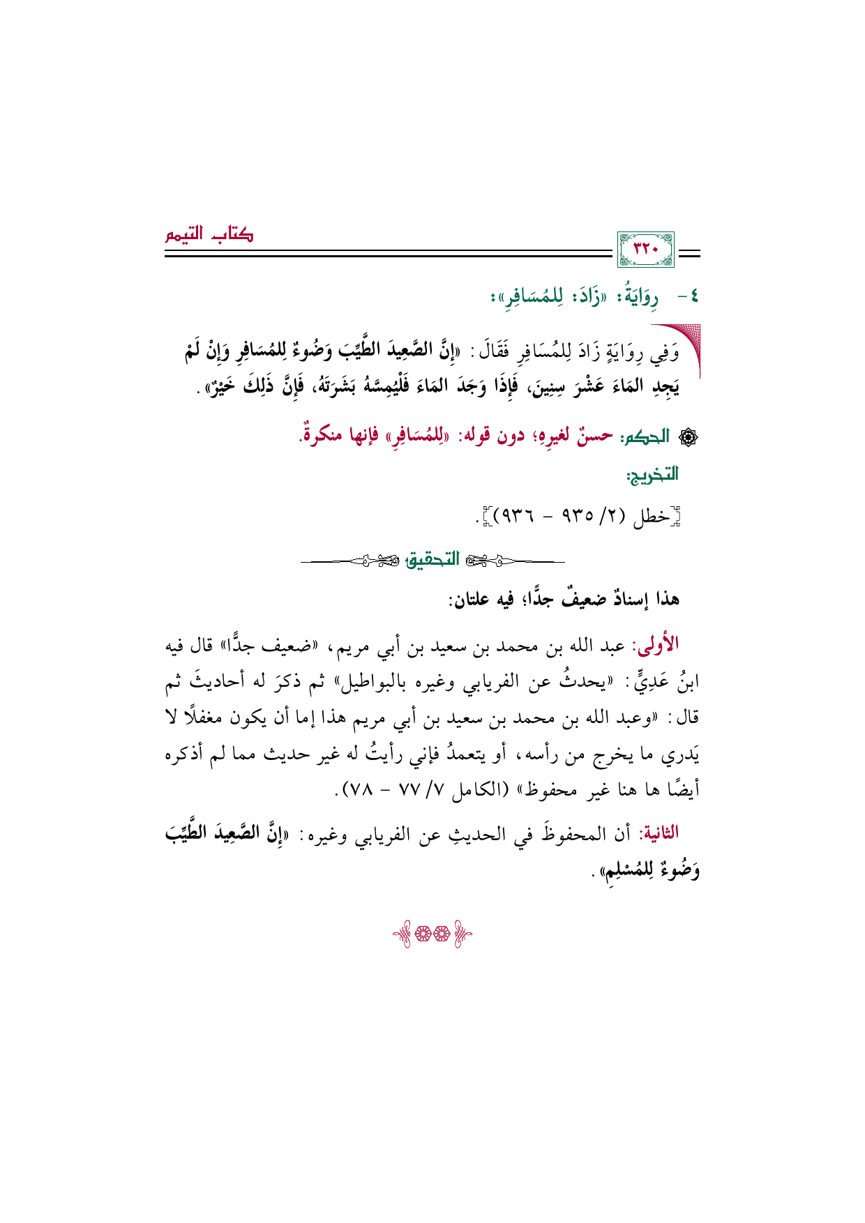 الثانية: أن المحفوظَ في الحديثِ عن الفريابي وغيره: ((إِنَّ الصَّعِيدَ الطَّيِّبَ وَضُوءٌ لِلمُسْلِمِ)).