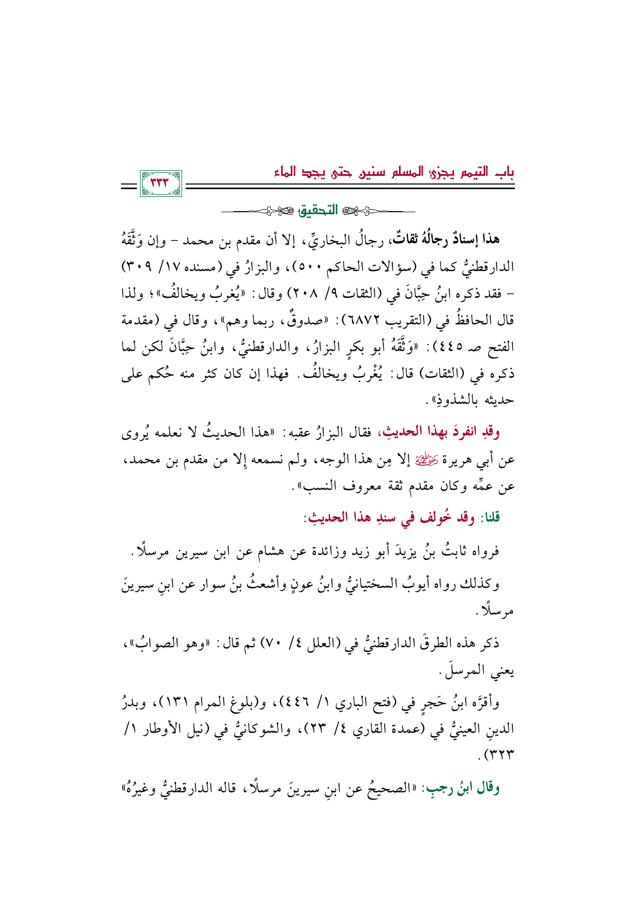وأقرَّه ابنُ حَجرٍ في (فتح الباري ١/ ٤٤٦)، و (بلوغ المرام ١٣١)، وبدرُ الدينِ العينيُّ في (عمدة القاري ٤/ ٢٣)، والشوكانيُّ في (نيل الأوطار ١/ ٣٢٣).